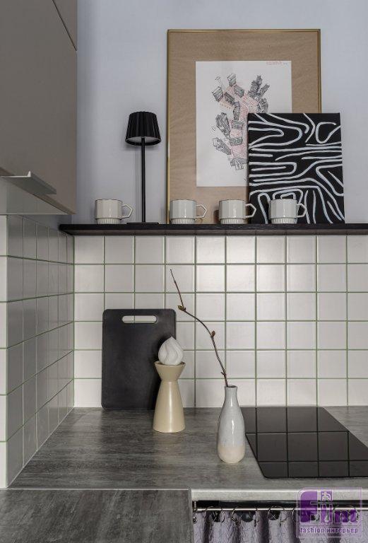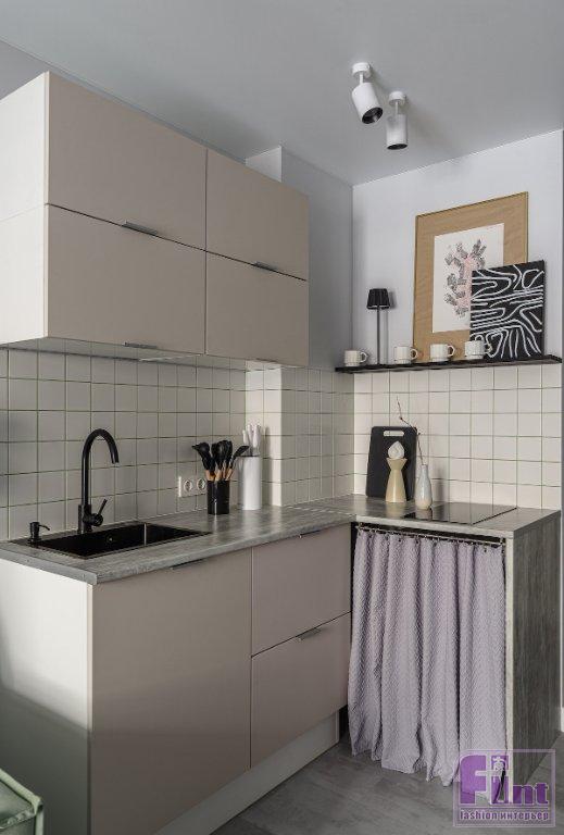 В прихожей встроили шкаф для одежды и обуви. Рядом с входной дверью — обувница, на которую также удобно положить ключи и другие мелочи. Кухня — компактная, но получилось уместить всё необходимое для того, чтобы приготовить и разогреть пищу. Расположили три нижних модуля, один из которых закрыли шторкой вместо стандартных фасадов — получилось и сэкономить, и добавить уюта. Верхние шкафы — только по одной стене, на другой повесили открытую полочку для посуды и декора.