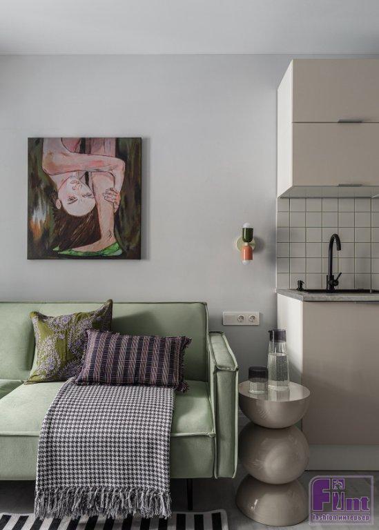 В качестве спального места предпочли раскладной диван, чтобы в дневное время в студии было больше свободного пространства. Напротив дивана — тумба-комод под телевизор. У дивана — пара столиков разной формы, но одинаковых по цвету. Столики смогут играть роль прикроватных тумбочек, когда диван разложат для сна.