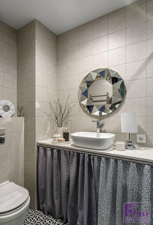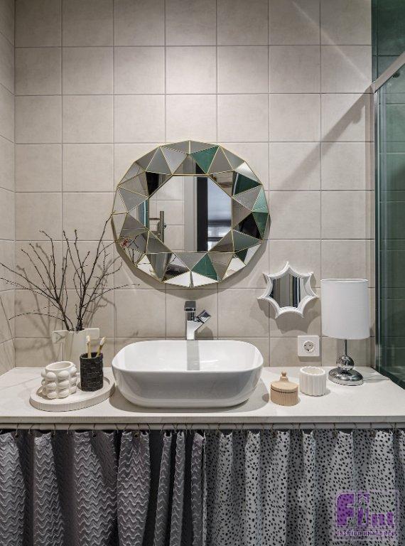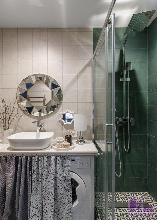 В ванной комнате — хранение под раковиной вместе со стиральной машиной. Вместо дверок так же, как и на кухне — шторка. «Часто мы считаем, что текстиль под столешницей — это «бабушкино» решение, хотя именно оно может создать дополнительный уют, красивую драпировку и сэкономит бюджет», — комментирует Мария. На балконе расположили ещё один шкаф для вещей.