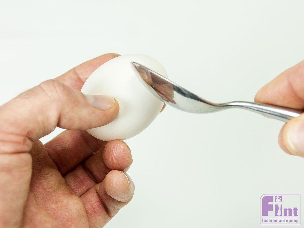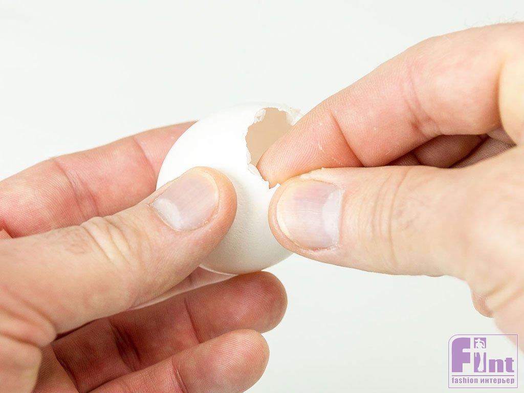 Для начала подготовьте яйцо, удалив его содержимое. Разбейте скорлупу ложкой ближе к острому концу яйца. Продолжайте постукивать по яйцу, создавая отверстие шириной около 2,5 см. Снимите осколки скорлупы и вылейте яйцо в подходящую ёмкость, чтобы использовать его для приготовления яичницы или омлета на следующее утро. Если желток будет препятствовать удалению содержимого яйца, просто размешайте его внутри скорлупы.