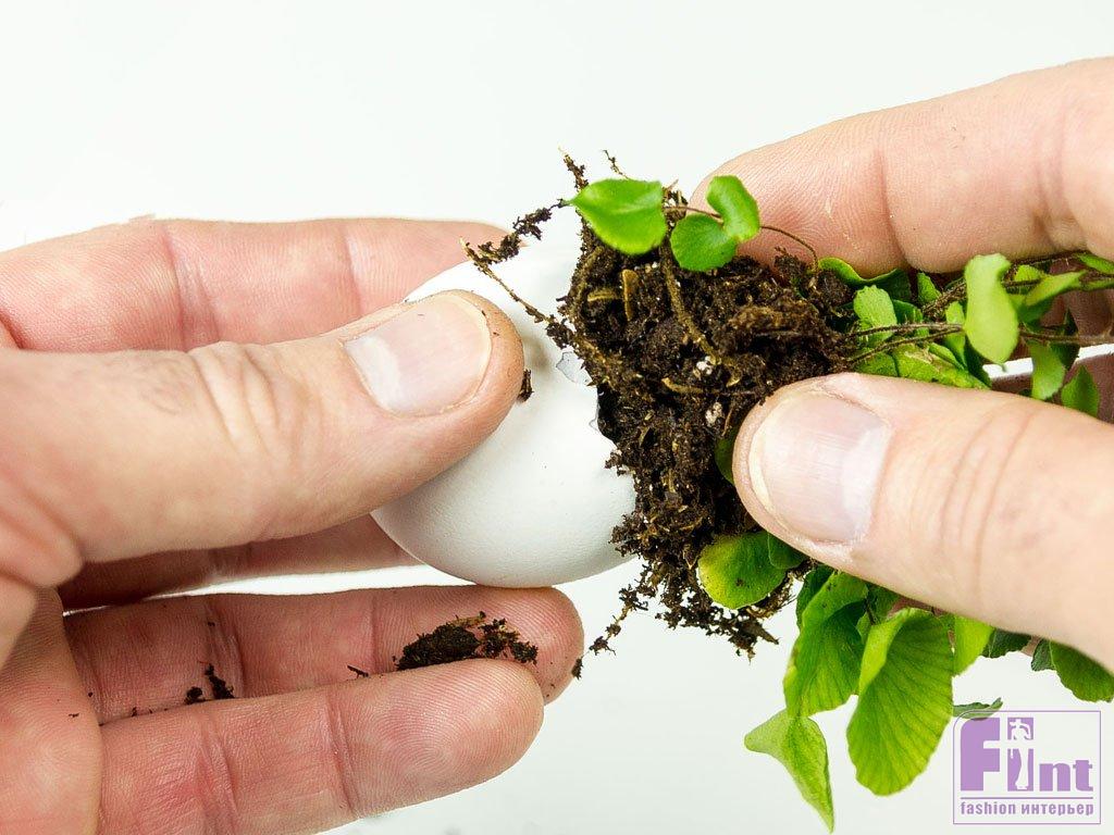 Достаньте растение из контейнера или горшка, удалите часть лишней почвы, ориентируясь на внутренний объём скорлупы. Аккуратно опустите растение в яичную скорлупу, при необходимости помогая себе зубочисткой или чем-то аналогичным.