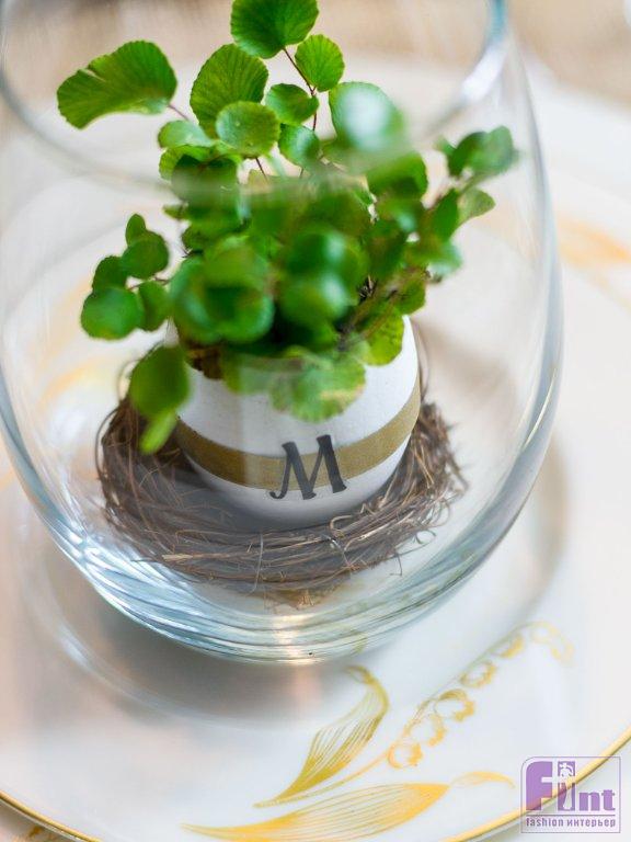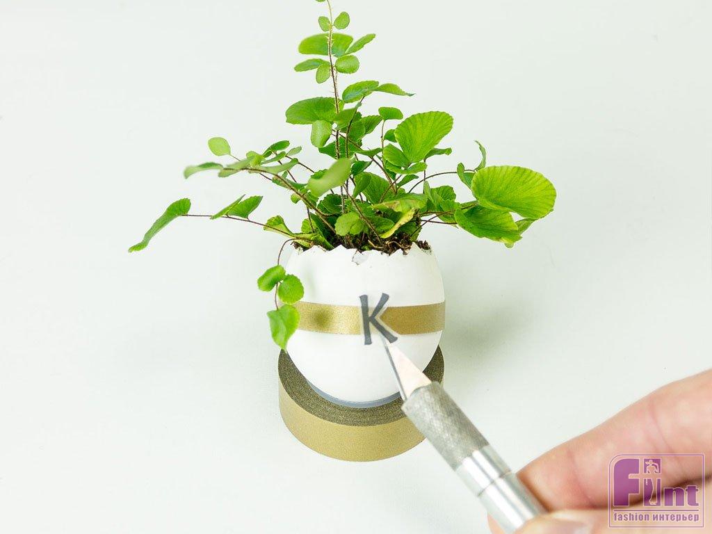 Теперь пришло время украсить яичную скорлупу. Оберните середину яйца золотой клейкой лентой. Наклейте на середину ленты самоклеящуюся букву-монограмму, соответствующую имени вашего близкого или вашему собственному. Мы использовали глянцевую золотую клейкую ленту, но вы можете выбрать любую подходящую ленту, и даже украсить яйцо, нарисовав на нём полоски с помощью маркеров. Завершите оформление террариума, поместив на дно стакана декоративное птичье гнёздышко. Установите в гнёздышко ваше яйцо с террариумным растением и всё готово!