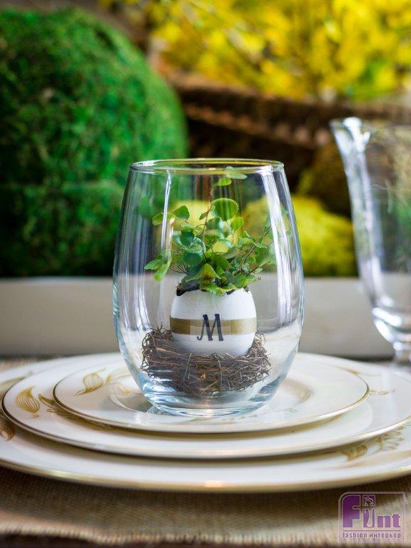 Сочетая натуральные элементы, изысканные изделия и необработанные материалы, вы можете создать неповторимый образ для вашего пасхального стола. Эта простая, но элегантная поделка позволит вам со вкусом сервировать праздничный стол. Крошечное гнёздышко и яичная скорлупа придают этому террариуму причудливость и элегантность одновременно. А после завершения Светлой Пасхи этот стильный аксессуар сможет отлично украсить ваш интерьер на долгое время. Нужно будет лишь изредка добавлять немного влаги для растения.