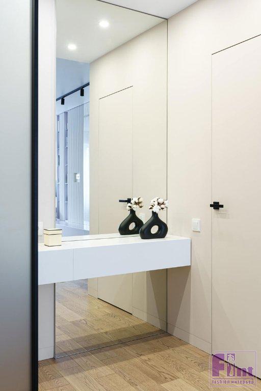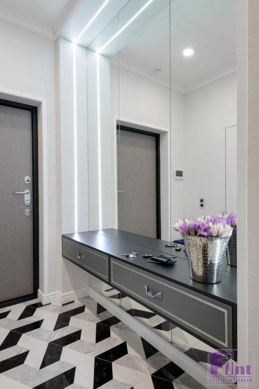 Если выбрать зеркальное полотно во всю стену, консоль или полку в прихожей можно монтировать прямо на него. Да, будет не совсем удобно смотреться в зеркало в полный рост, однако большое полотно поможет визуально увеличить пространство прихожей, если оно не достаточно просторное. Такие решения трудно реализовать самостоятельно, поскольку требуется сверление отверстий в зеркале и монтаж большого зеркального полотна, поэтому лучше заказать готовый комплект вместе с установкой у профессионалов.