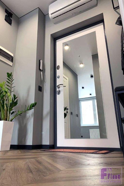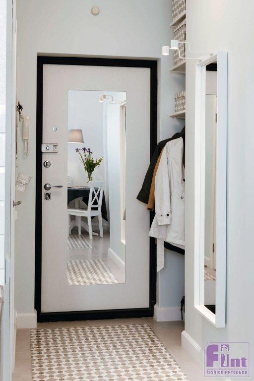 Если в прихожей нет свободной стены или хочется занять ее чем-то другим, оптимальный вариант — повесить зеркало на дверь. Как правило, выбирают уже готовые модели дверей с зеркалом (то есть подумать о планировке прихожей надо в самом начале ремонта) или заказывают накладку на входную дверь от застройщика. Это решение отлично подходит как для скромных по площади прихожих, так и для просторных холлов. Важно понимать, что не следует вешать зеркало на обычную дверь, поскольку зеркальное полотно довольно существенно утяжеляет конструкцию и стандартные петли могут не выдержать.