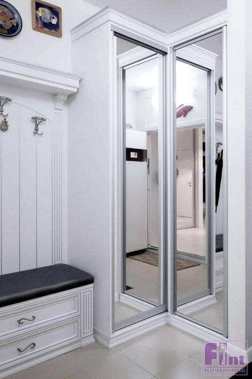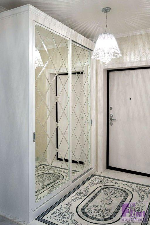 Ещё одна идея в том случае, если не хватает свободных стен в прихожей, или она маленькая. Шкафы дизайнеры стараются уместить даже в небольших пространствах, а застройщики уже проектируют ниши для встроенных шкафов во входной зоне, избавляя от необходимости выстраивать их на этапе ремонта. Зеркальные фасады шкафов – это, пожалуй, самое распространённое решение для установки зеркал в прихожих, благо производители такой мебели предлагают огромный выбор моделей в различной цветовой гамме и форме.