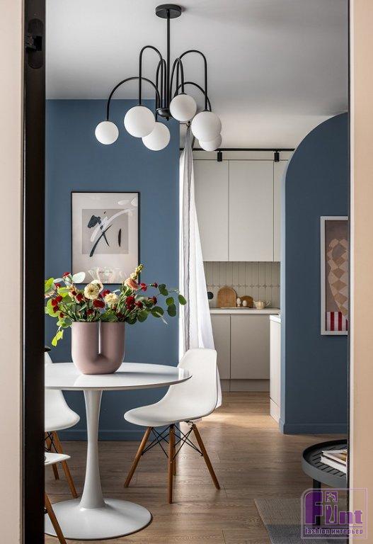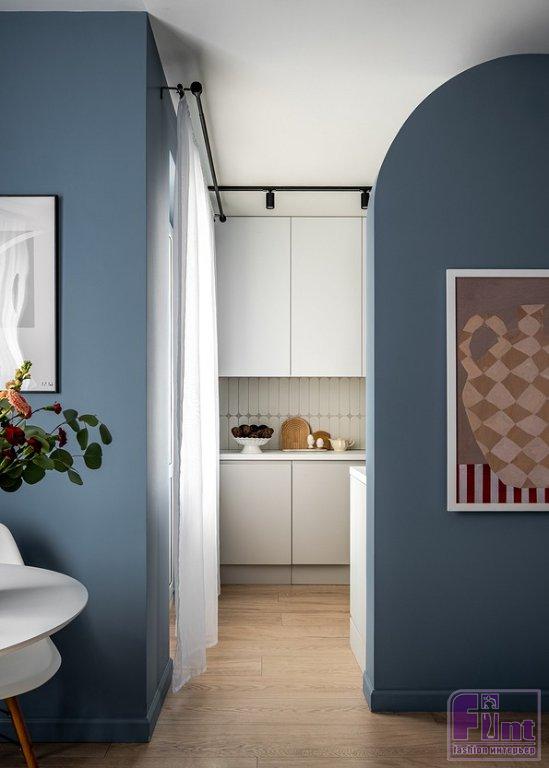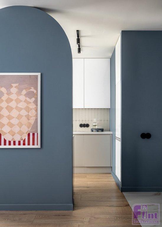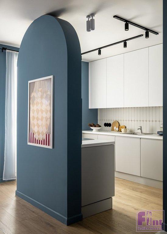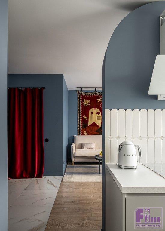 Для отделки стен выбрали краску — это оптимальное решение для арендных квартир. По мнению дизайнера, окрашенную стену, при необходимости, можно локально отремонтировать. На пол уложили кварцвинил под дерево. В прихожей — керамогранит под мрамор, и такой же керамогранит уложен на стенах и на полу в ванной комнате. Арочную форму перегородки между кухней и гостиной дизайнер повторила в окраске стены в изголовье кровати, для акцента выбрали горчичный оттенок. Плитка на кухонном фартуке тоже дублирует форму арки. Сегодня арки снова на пике моды.