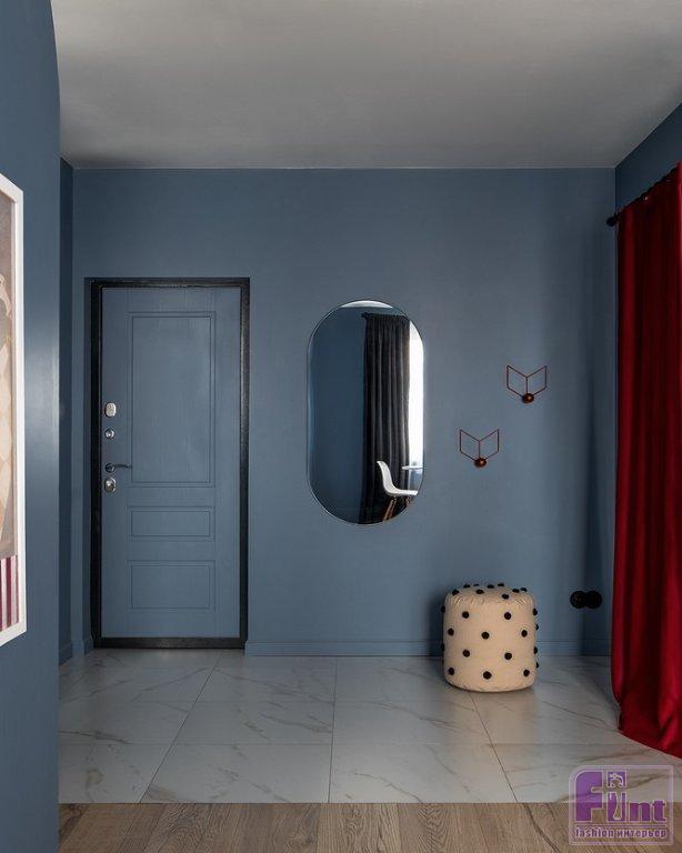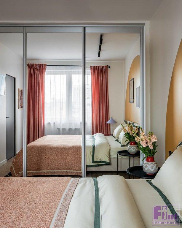 При создании планировки дизайнер выделила проходную гардеробную в прихожей, которую закрыли акцентной красной шторой. В гардеробной можно хранить не только сезонные вещи, но и верхнюю одежду и обувь. Это позволило освободить входную зону от шкафа. Все хозяйственное хранение, включая стиральную машину, разместили в постирочной, дверь в которую открывается тоже из прихожей. В спальне установили шкаф-купе с зеркальными фасадами — так удалось визуально увеличить пространство небольшой комнаты.