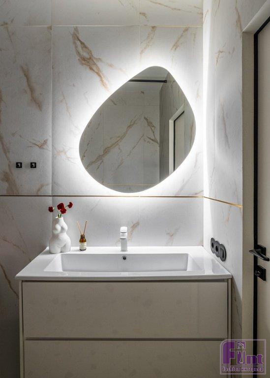 Для общего света выбрали трековые светильники чёрного цвета, которые графично выделяются на белом потолке, а также поворотные парные споты. Над обеденной зоной разместилась красивая люстра, конструкция которой тоже включает арочные формы. В спальне роль дополнительного освещения играют светильники на прикроватных тумбах, а в ванной комнате — зеркало с подсветкой.
