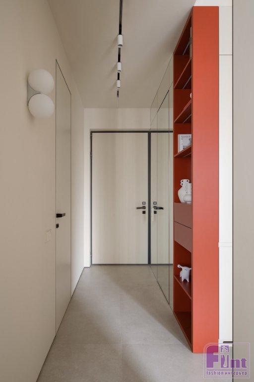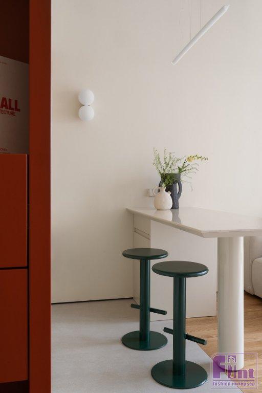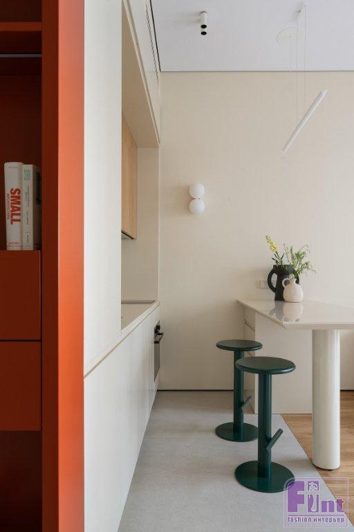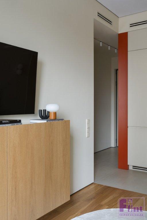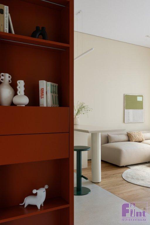 В гостиной установили высокий комод, где можно хранить книги и документы, мягкий модульный диван. Акцентом выступает футуристичный придиванный столик главного акцентного цвета в интерьере — терракотового. В ванной комнате из систем хранения предусмотрены тумба под раковину, шкаф над инсталляцией и встроенный стеллаж между ванной и инсталляцией. Общий сценарий света — минималистичные встроенные светильники и треки. Над барной стойкой — лаконичный линейный подвес, а на стене рядом — бра. Такое же бра размещено в прихожей. В спальне для дополнительного освещения — бра по двум сторонам от кровати. В ванной комнате — подвес у зеркала, но также множество скрытых подсветок: потолка, полок стеллажа.