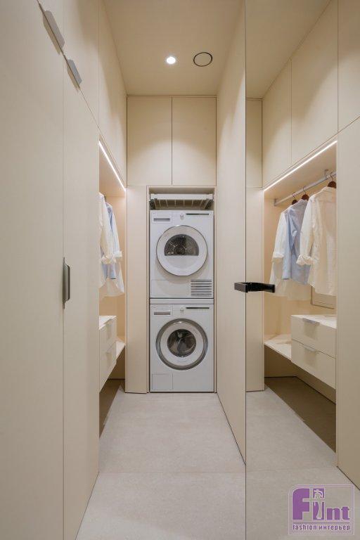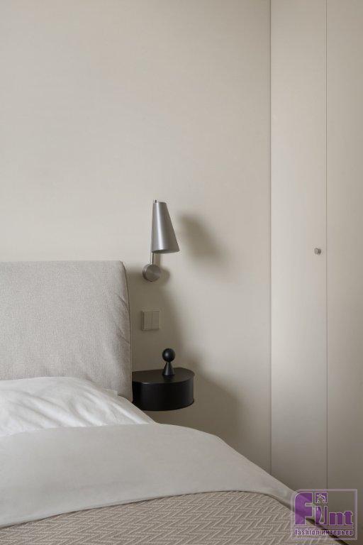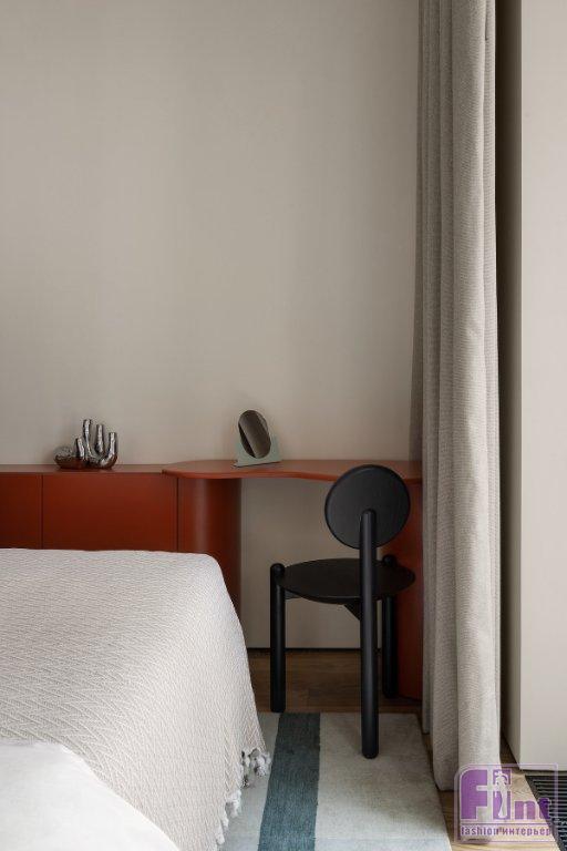 На этапе планировки специально выделили гардеробную, чтобы освободить пространство от габаритных шкафов. В гардеробной можно хранить повседневную одежду, сезонные вещи, также там размещены стиральная и сушильная машины. В спальне встроен шкаф для повседневной одежды. Минималистичные фасады в цвет стен сделали намеренно, чтобы система хранения визуально не загромождала пространство. Акцентный элемент спальни — терракотовая консоль, переходящая в небольшой стол, который можно использовать в качестве рабочего или туалетного столика.