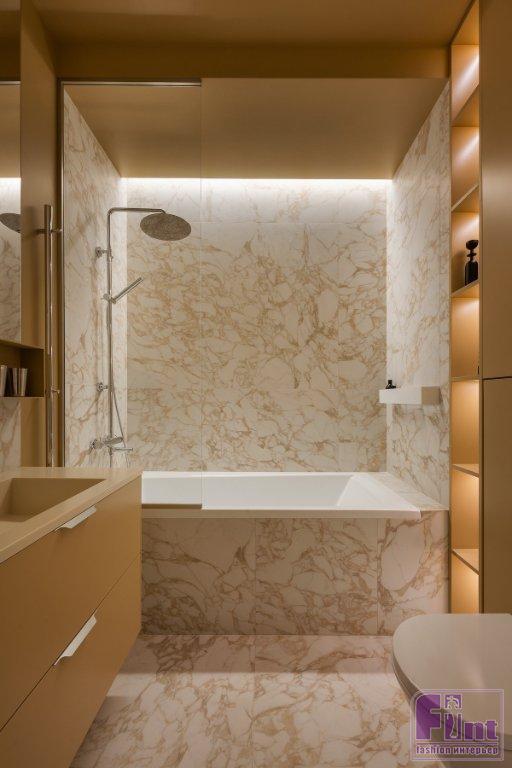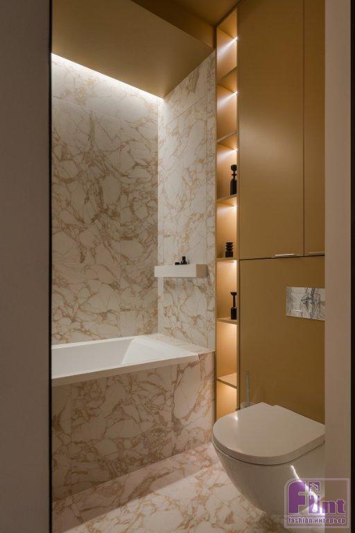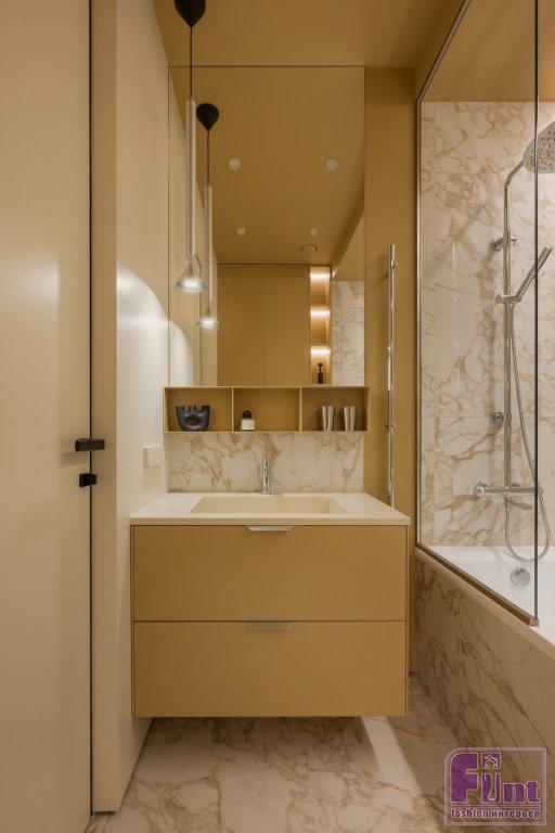 На кухне и в прихожей — одинаковый керамогранит песочного цвета. В ванной комнате керамогранит под мрамор с бежевыми прожилками скомбинировали с влагостойкой краской горчичного цвета. За счет того, что в такой цвет окрашен даже потолок, санузел получился очень камерным и уютным.