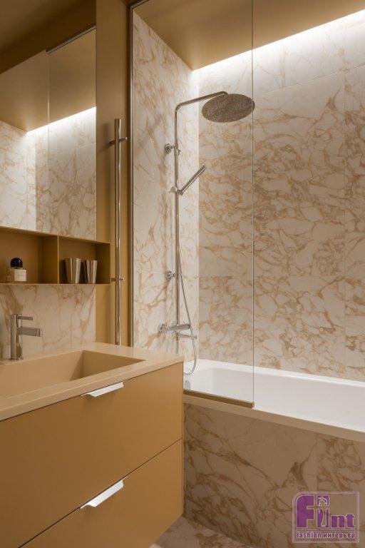 На кухне и в прихожей — одинаковый керамогранит песочного цвета. В ванной комнате керамогранит под мрамор с бежевыми прожилками скомбинировали с влагостойкой краской горчичного цвета. За счет того, что в такой цвет окрашен даже потолок, санузел получился очень камерным и уютным.