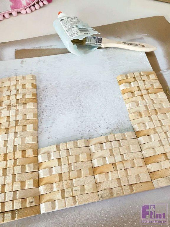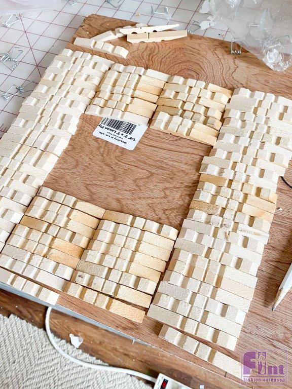 Соблюдая рисунок и направление рельефа на прищепках, приклейте их с помощью клея по дереву на основу, согласно выбранному узору. У нас получилось 8 рядов по 4 прищепки сверху отверстия для фото, по 10 рядов из одной прищепки по бокам от отверстия для фото и 9 рядов по 4 прищепки снизу от фото. Вы можете расположить прищепки любым удобным вам образом, чтобы создать другой образ.