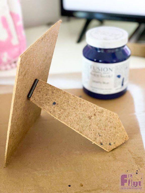 У нас в запасе была старая фоторамки не очень большого размера, но у неё была отличная задняя часть с прочной ножкой-подставкой. Эту заднюю часть мы прикрепили к картону, вырезанному по размеру рамки, который мы определили.