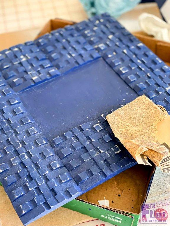 Когда краска высохнет, для придания поверхности потёртого винтажного вида обработайте окрашенную поверхность прищепок наждачной бумагой мелкой зернистости, чтобы удалить часть краски с выступающих частей. Не забудьте также обработать наждачной бумагой и боковые края рамки. Шлифуйте без сильного нажима, чтобы снять небольшое количество краски.