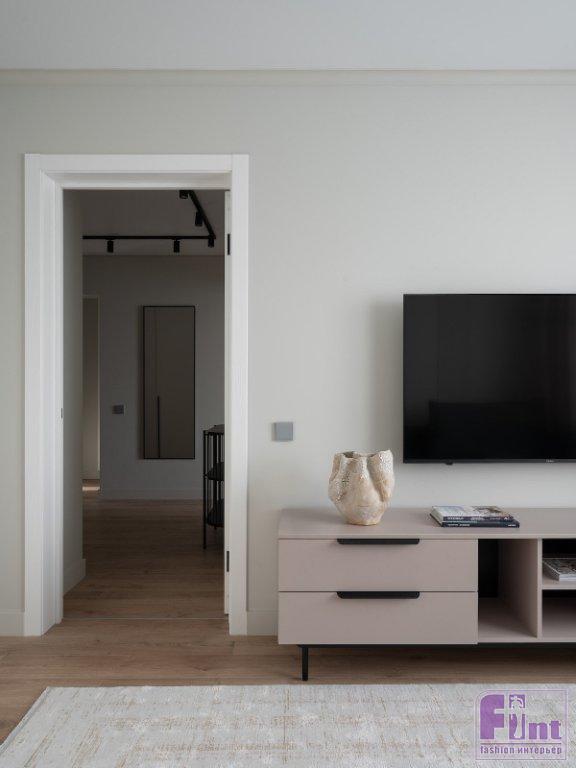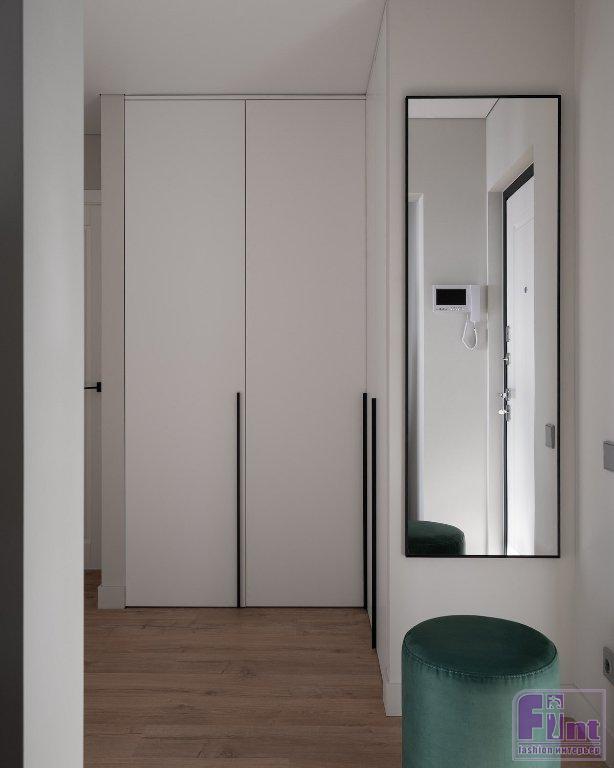 Чтобы уместить все вещи хозяйки, дизайнер спланировала разнообразные системы хранения. Так, в прихожей встроили шкаф для верхней одежды и обуви. Пространство достаточно большое, правильной формы. Чтобы уравновесить его, также установили консоль напротив входной двери. В гостиной — отдельная гардеробная для хранения сезонных и других вещей хозяйки. Для приёма гостей в комнате предусмотрены мягкий диван с креслом, а для дополнительного хранения — тумба под телевизор. В спальне — встроенный шкаф для повседневной одежды.