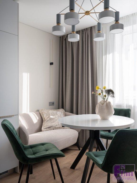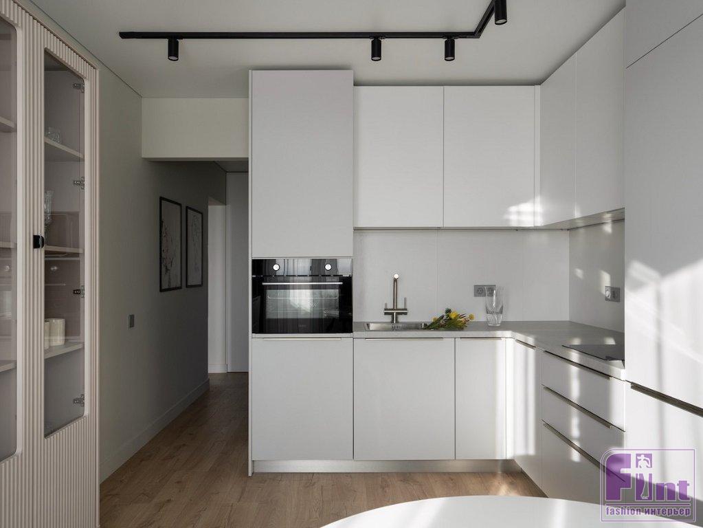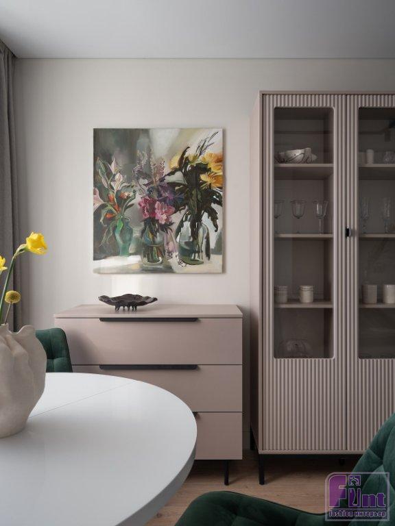 На кухне — вместительный угловой гарнитур, который дополнили комодом и шкафом-витриной для красивой посуды. Обеденная группа состоит не только из стола и стульев, но и мини-диванчика. Стол раскладывается на случай приёма гостей. К кухне примыкает лоджия, где также смонтировали шкаф для хранения разных вещей.
