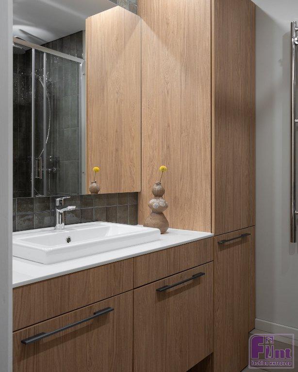 В ванной комнате удалось уместить много систем хранения: тумба под раковину с пеналом, а также шкаф над стиральной машиной. В последнем спрятан водонагреватель. В санузле — шкафчик над инсталляцией унитаза.