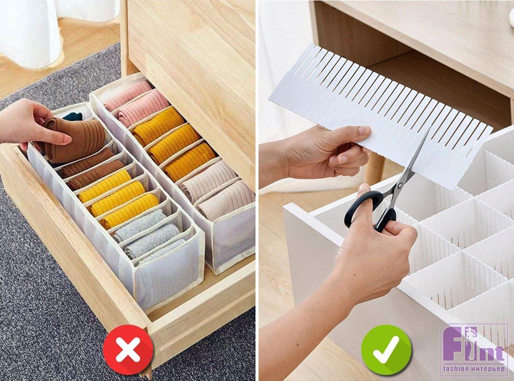 На первый взгляд кажется, что мягкие коробки с ячейками — идеальный способ хранения мелких вещей вроде белья. Но отсеки часто слишком маленькие — даже носки туда помещаются с трудом. А если вещь чуть объёмнее, она вообще может не влезть в ячейку. Такие органайзеры быстро деформируются, а из-за фиксированной формы не подходят для разных типов вещей. Вместо них лучше выбрать регулируемые разделители для обычных полок и ящиков. Это более простой и универсальный вариант.