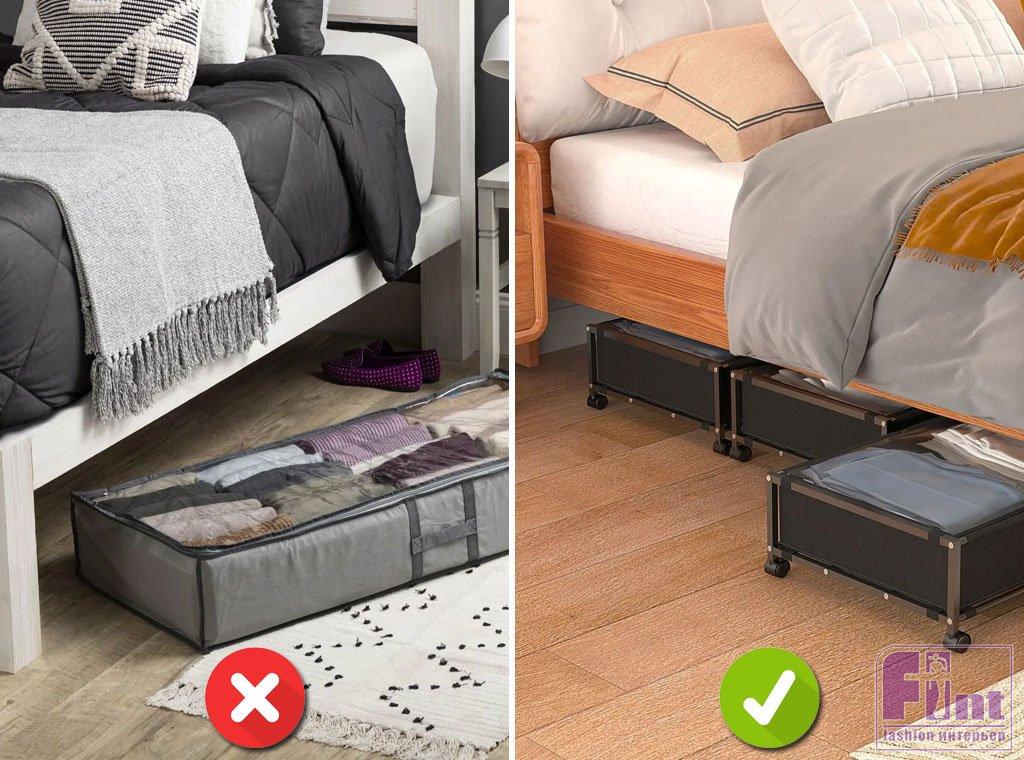 Задействовать место под кроватью — простой и эффективный способ выкроить в комнате дополнительную зону для хранения. Но важно, во что вы будете складывать вещи. Обычные низкие контейнеры быстро превращаются в пылесборники. Их сложно выдвигать, они сбивают ковры и могут поцарапать напольное покрытие. Чтобы не пришлось каждый раз лезть на коленях под кровать, выбирайте модели с колесиками. Ещё более удобная альтернатива — выдвижные ящики, встроенные в основание кровати.