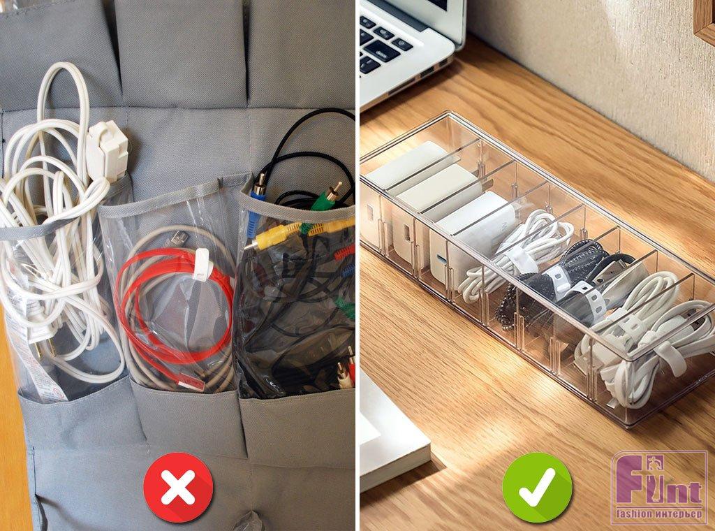 Органайзеры в виде кармашков на липучках или молнии — скорее декоративное, чем практичное решение. Они не решают проблему спутанных проводов, потому что внутри те всё равно лежат хаотично свёрнутыми, а также не подходят под крупные зарядные устройства. Если такие карманы хранятся вертикально, со временем они провисают. Лучше использовать кабель-менеджеры с фиксаторами или специальные органайзеры с отсеками — они надежнее и удобнее.