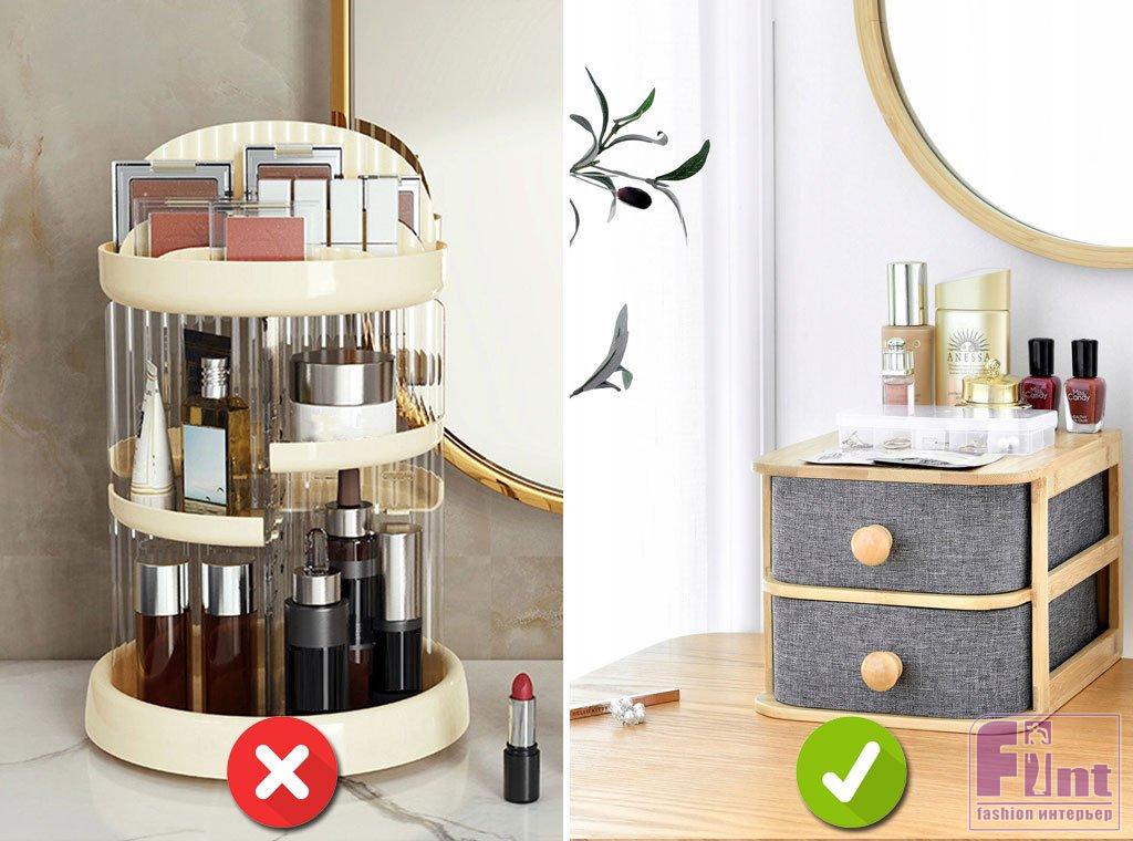 Кажется, что организовать большое количество косметики удобно именно так — в одной конструкции с разными отсеками и возможностью её вращать, а не искать нужное вслепую. Но на практике органайзер неудобно чистить, он занимает много места на столешнице и быстро захламляется. Кроме того, большинство таких стоек сделаны из дешёвого пластика, который не украшает интерьер. В данном случае лучше использовать ящик с контейнерами внутри либо несколько компактных косметичек с секциями.