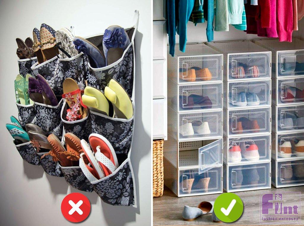 Мягкие органайзеры с секциями для обуви обычно вешают на дверцу шкафа изнутри. Такой способ хранения кажется удобным, но заполненная конструкция редко выдерживает вес стольких пар без последствий. Органайзер может провиснуть или вовсе оторваться и упасть. А в узких шкафах такие приспособления мешают другим вещам. Лучше хранить обувь на полках, в закрытой обувнице, коробках или контейнерах. Так и сами вещи дольше останутся в хорошем состоянии.