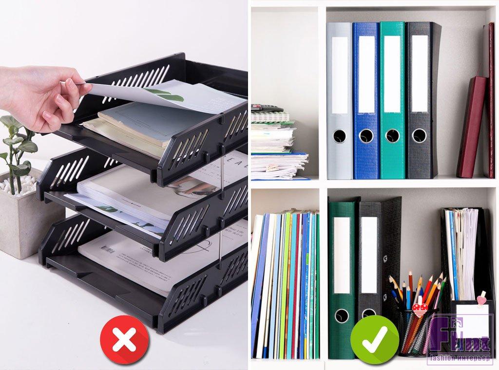 Привычное офисное решение дома приживается плохо. Горизонтальные лотки быстро превращаются в пристанище для бумаг, которые нужно разобрать «когда-нибудь потом», но оно наступает редко. В результате в органайзере скапливаются старые квитанции, инструкции, заметки и другая ненужная макулатура. Найти что-то в лотках сложно, нужно каждый раз вытаскивать нижние и перебирать всё содержимое. Гораздо удобнее вертикальные органайзеры или отдельные папки с файлами.