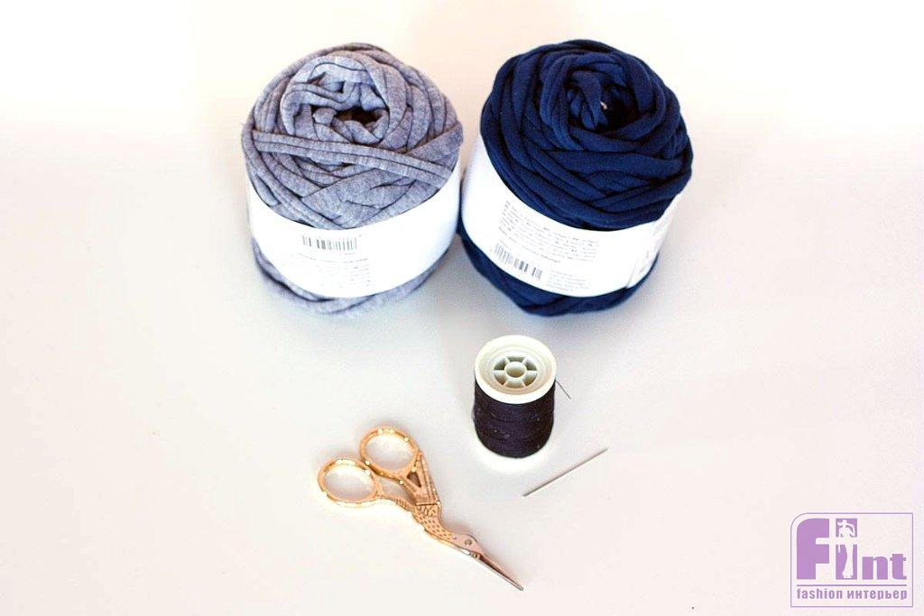 В этом мастер-классе мы будем использовать популярную трикотажную пряжу, из которой любители рукоделия часто плетут корзины. Такой материал доступен по умеренным ценам и в огромном ассортименте d магазинах для рукоделия и на популярных маркетплейсах. Кстати, эту пряжу вовсе не обязательно нужно покупать в магазине. Такую трикотажную пряжу можно легко сделать из старых футболок, просто порезав их на узкие полоски. В этом случае, ваш коврик буквально не будет стоить вам ни копейки, и вы сможете повторно использовать ненужные вещи с пользой, вместо того, чтобы выбрасывать их на помойку.