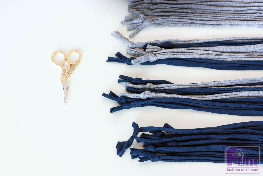 Нарежьте пряжу на отрезки длиной 50-60 см. Если вы планируете сделать более длинный коврик, увеличьте длину отрезков. Чтобы сделать коврик в нашем дизайне мы использовали 36 синих и 36 серых полосок пряжи. После того как вы заготовите отрезки пряжи, разложите их группами по 6 отрезков в каждой: две группы однотонные, и две группы со смешением цветов в различных пропорциях.