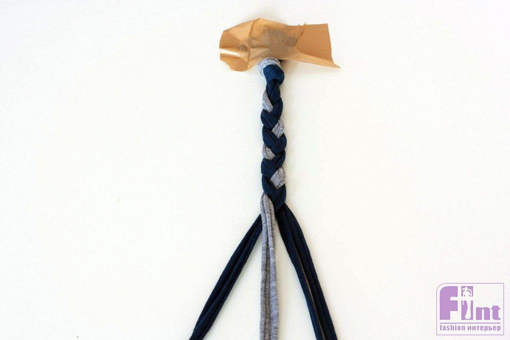 Завяжите узлом концы отрезков пряжи и начните заплетать её в классические тройные косы. Вы можете решить самостоятельно, какого цвета будут ваши косы: одноцветные или со смешением двух используемых цветов. Мы решили сделать будущий коврик с эффектом градиента по центру, когда один цвет будет плавно переходить в другой. Для этого мы взяли восемь кос синего цвета, такое же количество серых, и остальные четыре косы со смешанными цветами: две из которых сделали преимущественно синими, а две оставшиеся – преимущественно серыми. Идея состоит в том, чтобы сделать своего рода градиентный эффект на вашем коврике.