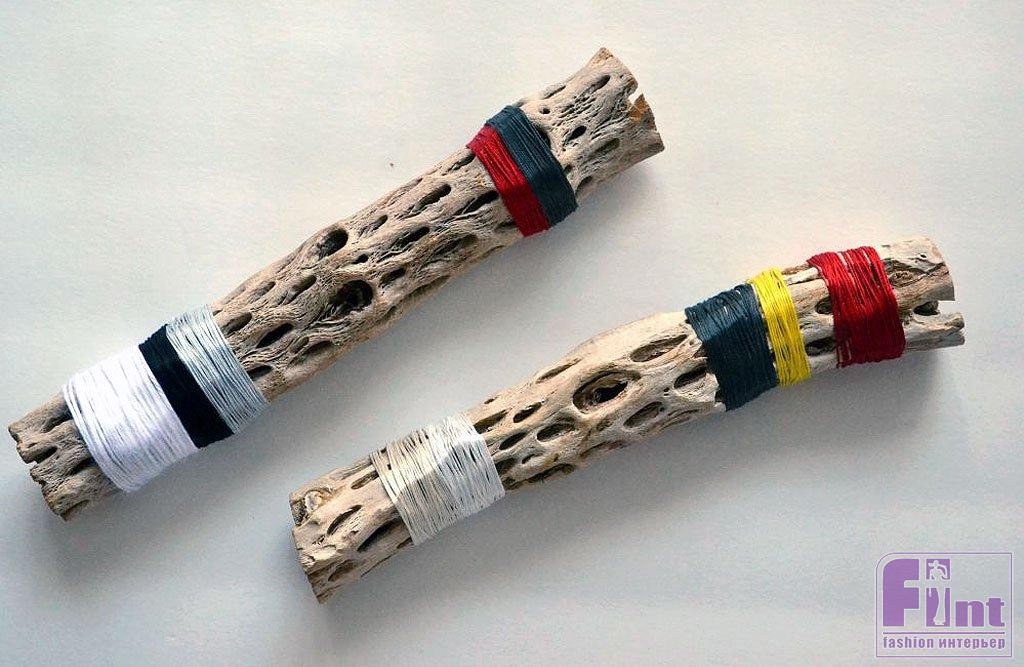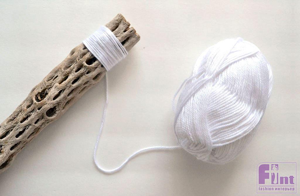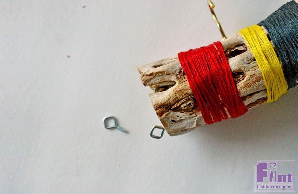 Начните обматывать корягу нитками для вышивания. На самом деле нет точного способа выполнения этого шага, кроме как убедиться, что шпагат туго намотан на корягу. Выбирайте своё сочетание цветов и ширину намотки, или воспользуйтесь нашим примером. Свободные концы ниток закрепите с обратной стороны с помощью клея для рукоделия.