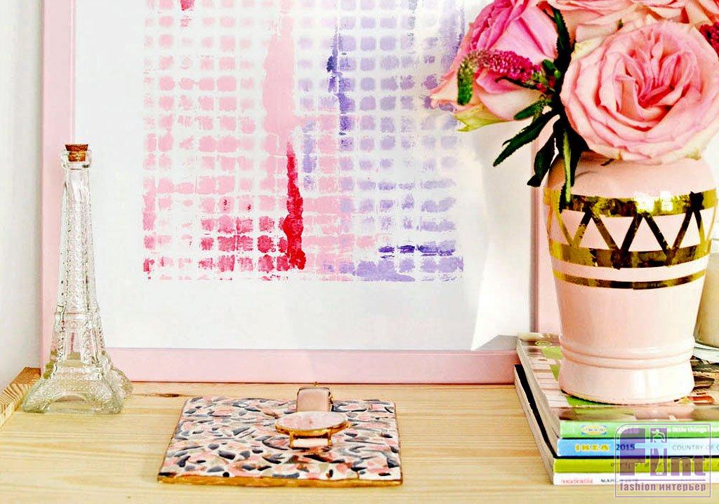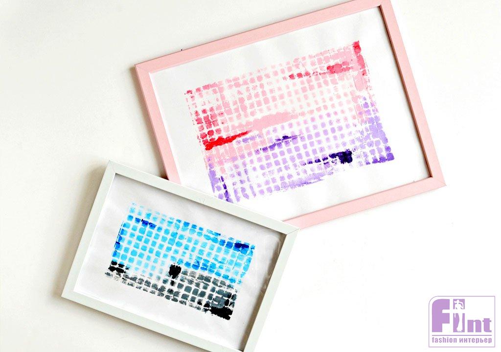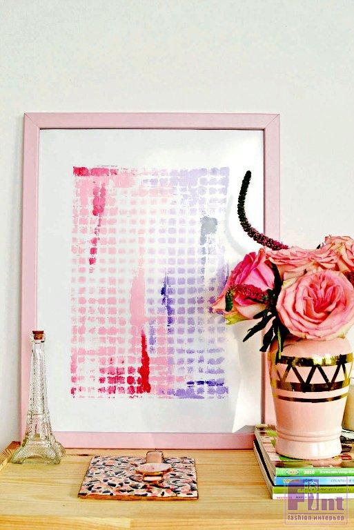 Сразу же снимите проволочную сетку и дайте картине высохнуть. Затем вставьте вашу картину в рамку для фото. В целом мы потратили на создание этой мозаичной картины чуть больше 10 минут! С помощью проволочной сетки мы смогли создать эффект мозаики, на создание которого в противном случае у нас ушла бы целая вечность, если бы мы сидели и рисовали квадратики по отдельности. Растекание и переход цвета придаёт этой картине цельность и, помимо мозаичного формата, содержит ещё один модный приём – эффект омбре, или перехода цвета.