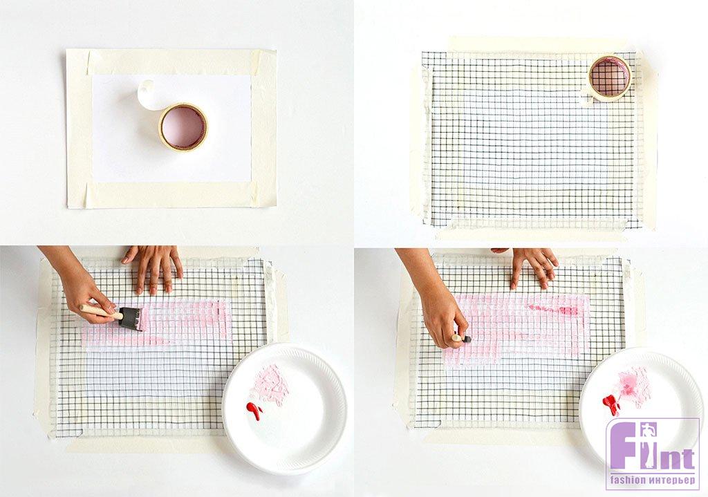 Закрепите с помощью малярной ленты проволочную сетку поверх вашего ватмана или картона. Для формирования рисунка вы можете использовать любые хорошо сочетающиеся друг с другом цвета, или использовать нашу цветовую палитру. Нанесите пастельно-розовый цвет на проволочную сетку с помощью широкой поролоновой кисточки. Мы можем создать эффект перехода цвета, проведя кистью по сетке один раз, так что к тому времени, когда вы дойдете до края листа, у вас закончится краска, а значит, и получится соответствующий внешний вид.