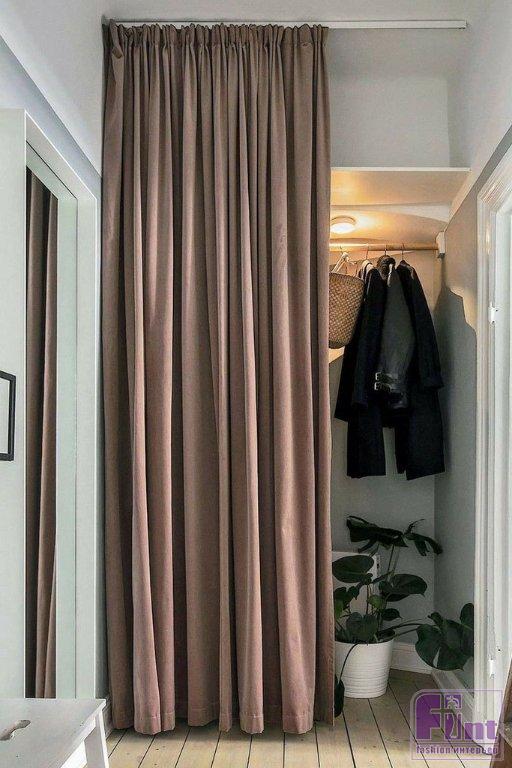 Ещё один способ сэкономить — отказаться от дверей и дверец. Закрыть проём в гардеробную, постирочную, кладовую или содержимое шкафа можно плотной текстильной шторой. Ткань стоит меньше, чем дверь или материал для неё, и не требует сложного монтажа. В любой момент её можно снять и постирать либо заменить, если захочется обновить интерьер. А еще так вы экономите место, поскольку не нужно оставлять зазор на плотное закрытие двери.
