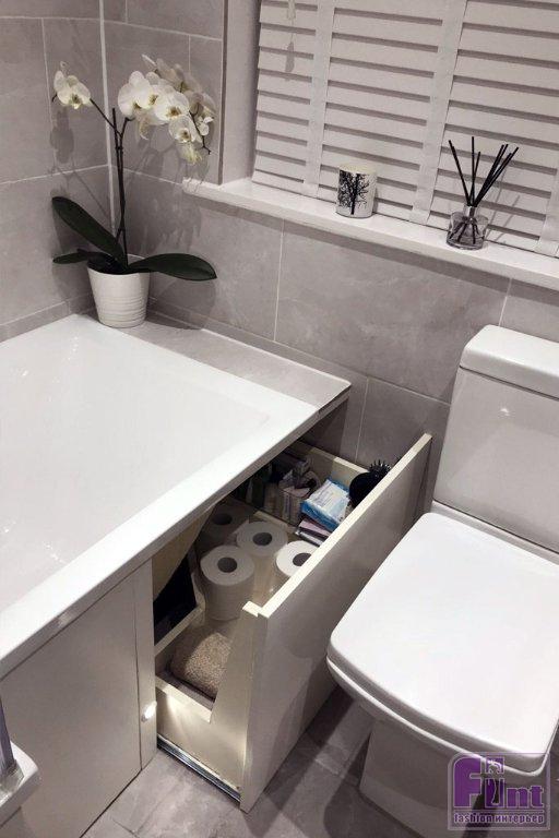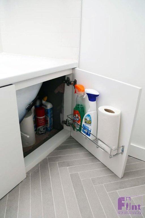 В ванной комнате приходится хранить хозяйственные мелочи, стиральный порошок, запасы туалетной бумаги, бытовую химию и т.п. Держать это на кухне или в прихожей не всегда удобно, но это не значит, что в санузле обязательно нужно выделять целый шкаф. Если места мало или вы хотите сэкономить, при этом у вас ванна, а не душ, задействуйте пространство под ней. Экран можно сделать своими руками из подручных материалов. Предусмотрите возможность открывать и закрывать его, и внутри получится полноценное и достаточно ёмкое место для хранения, а эта зона будет смотреться эстетичнее.