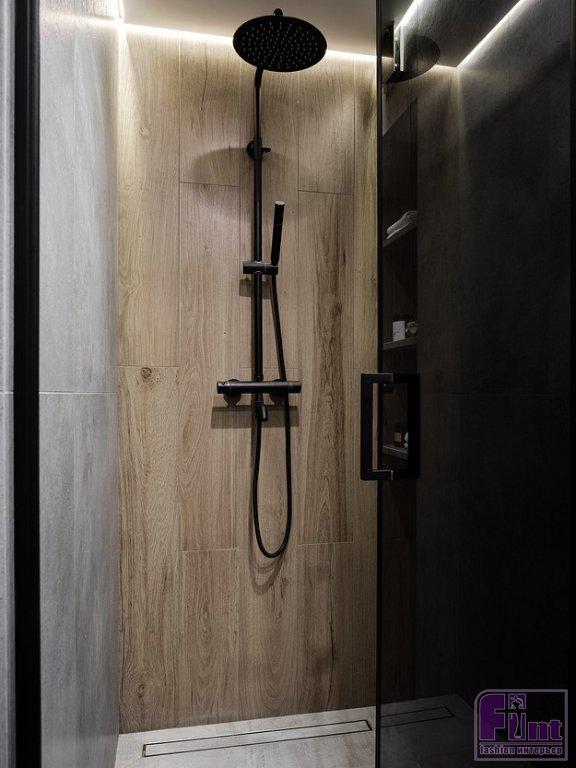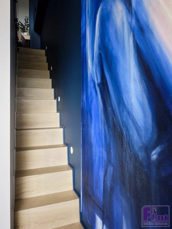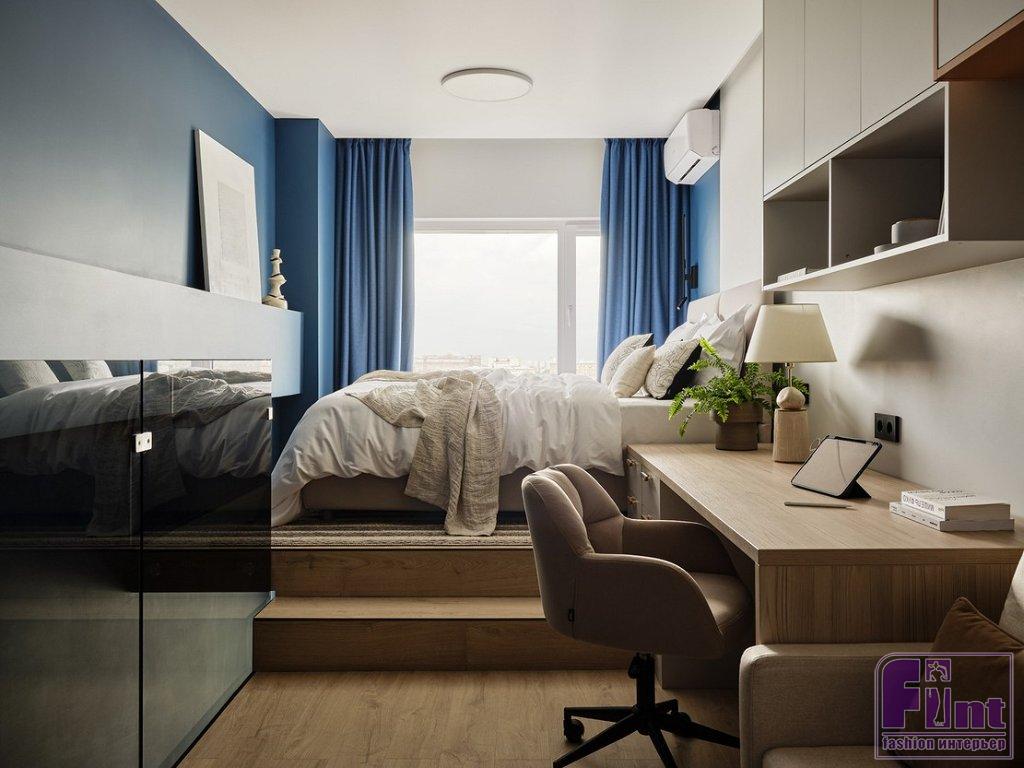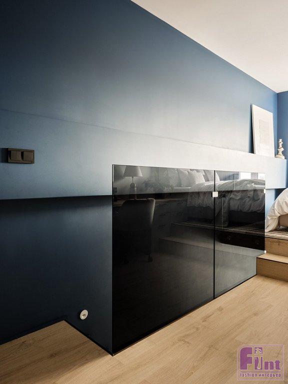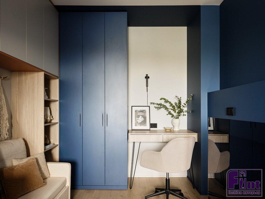 Особое внимание уделено визуальному увеличению площади квартиры, добавлению глубины пространству. Для этого идеально подошёл сложный холодный синий оттенок стен и мебели. В его поддержку выступают нейтральные светло-бежевые цвета и тёплые оттенки дерева.