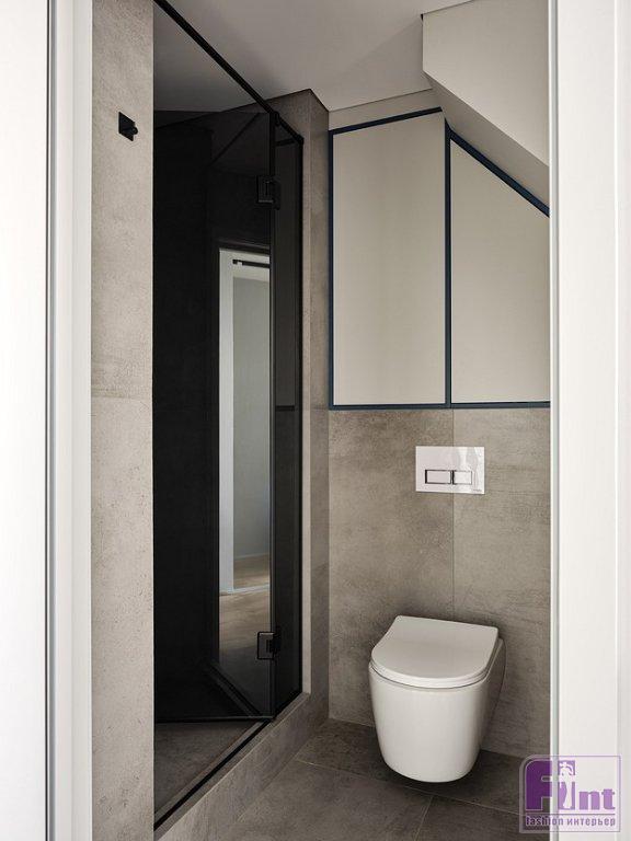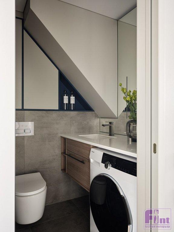 На первом этаже выполнили цементную стяжку. Дополнительную перегородку возвели из гипсокартона. Стены оштукатурили, зашпаклевали и окрасили. Потолки обшили гипсокартоном и немного понизили, чтобы встроить светильники и провести необходимые коммуникации. Полы в санузле и на лестнице облицевали керамогранитом, на остальной площади оформили износостойким ламинатом под дерево светлого тёплого оттенка.