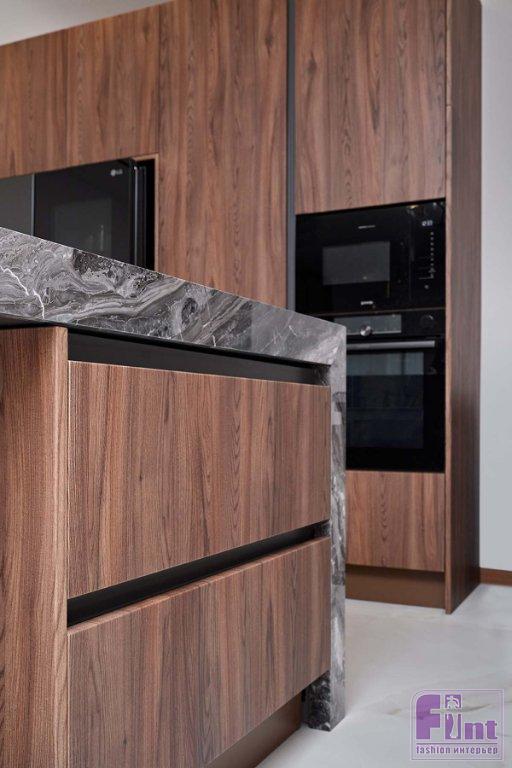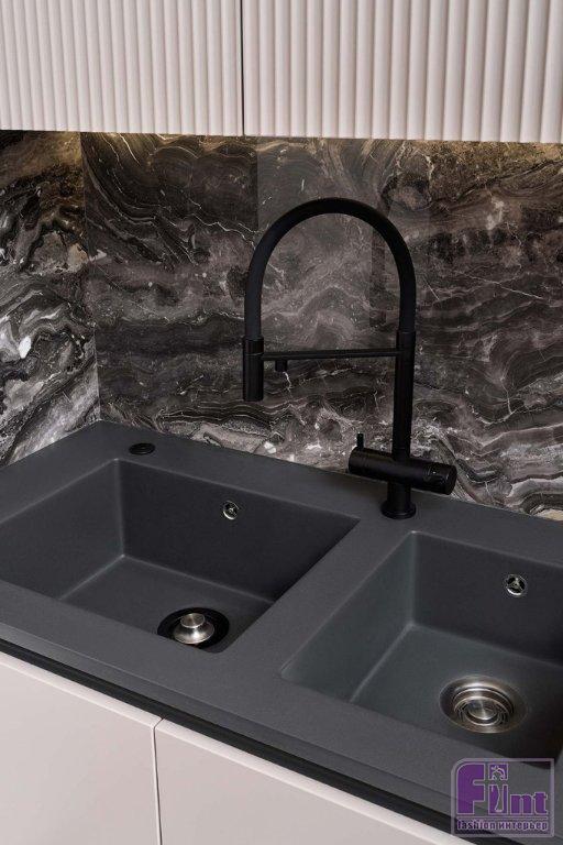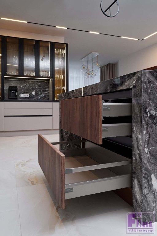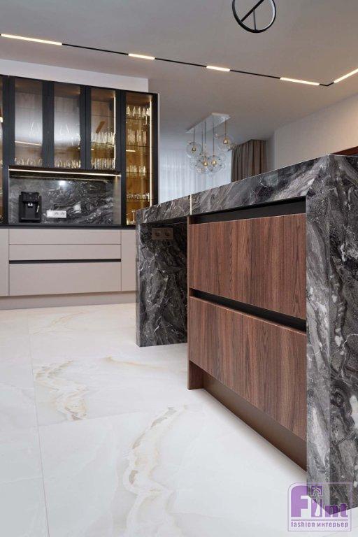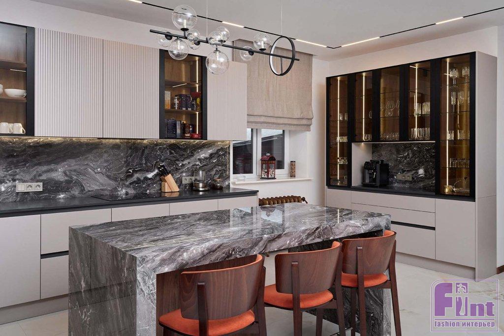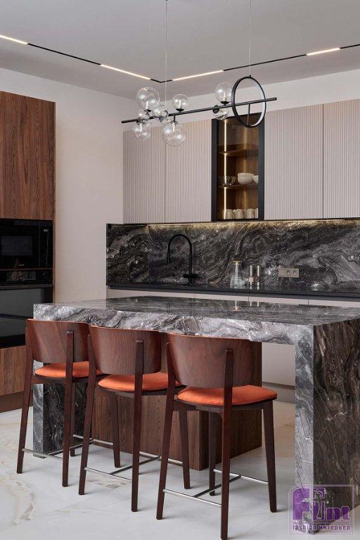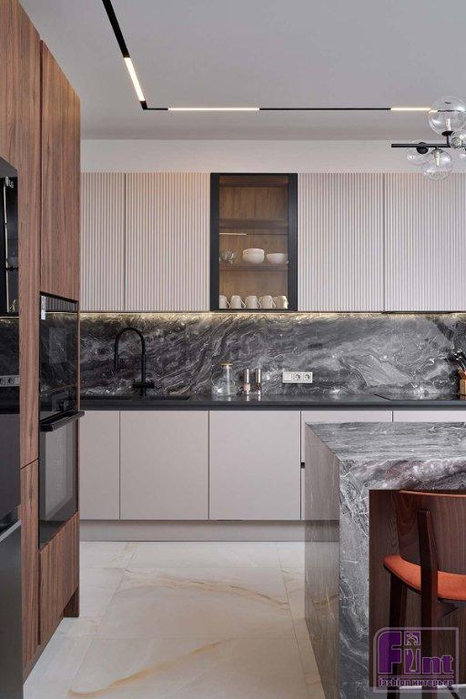 В отделке и мебели использовали палитру тёплых цветов в сочетании с оттенками натурального камня, дерева и деликатными чёрными акцентами. Этот микс создал спокойную, уютную и гармоничную атмосферу, в которой комфортно и приятно находиться. Фасады гарнитура представлены гладкими и рифлеными поверхностями, фактурой дерева и стеклом. Такое решение создает динамику пространства, добавляет индивидуальность и выразительность монохромному интерьеру.