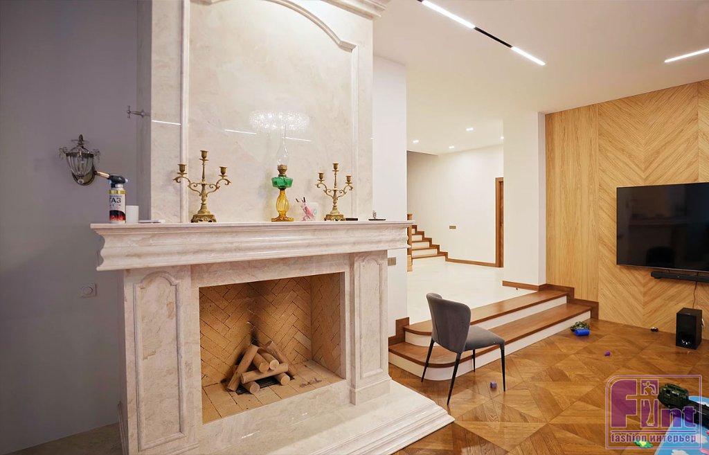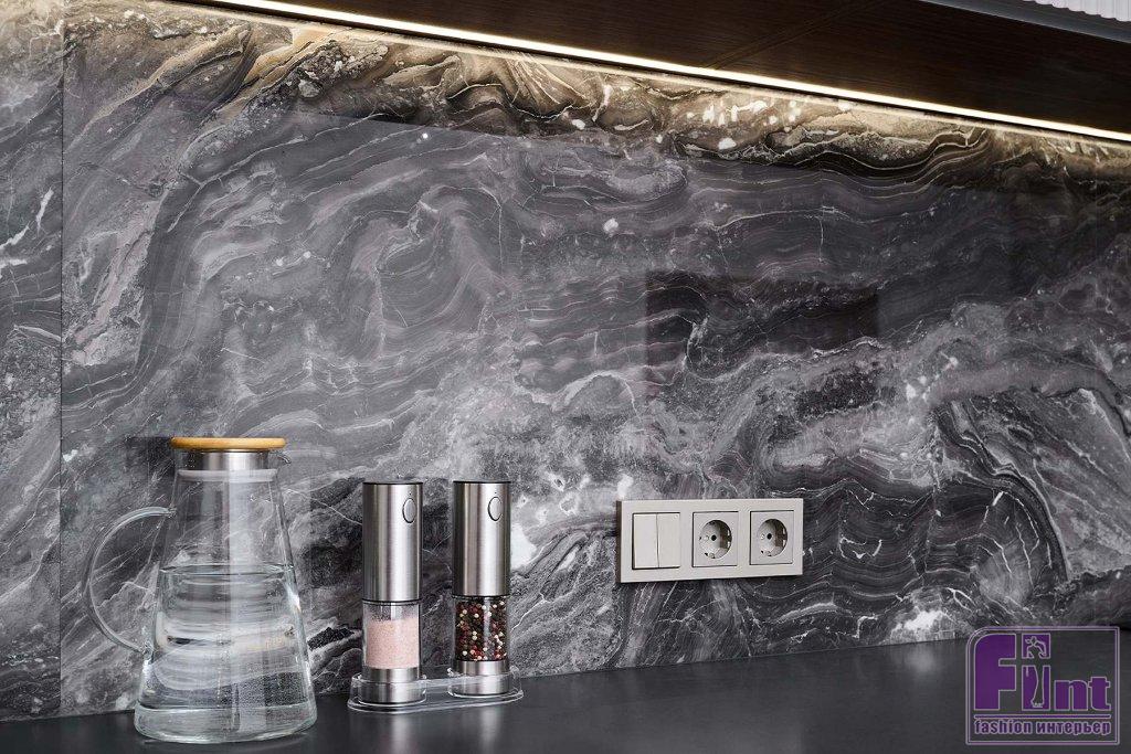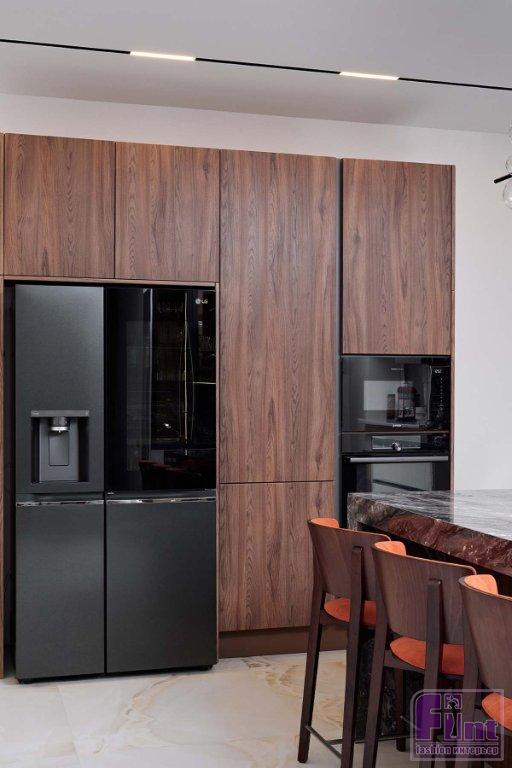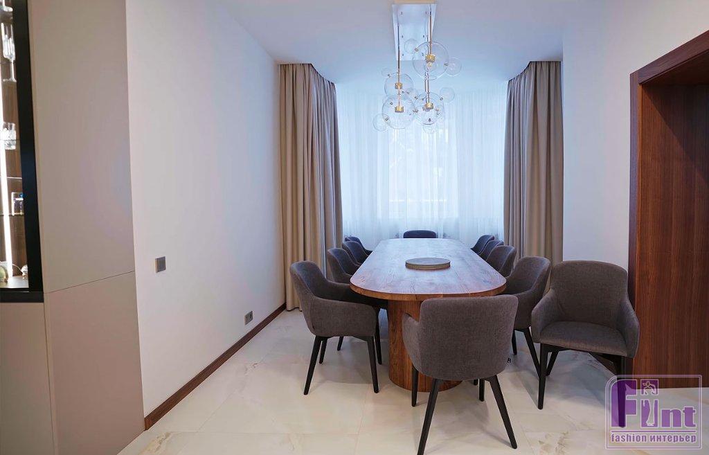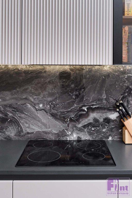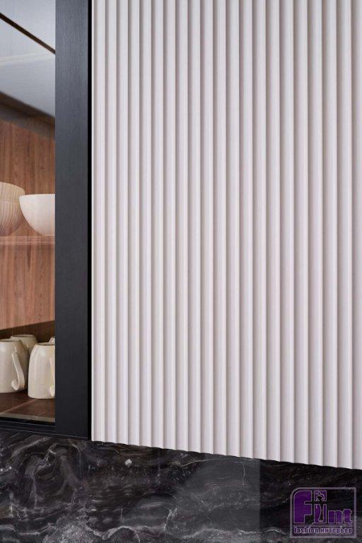 В отделке и мебели использовали палитру тёплых цветов в сочетании с оттенками натурального камня, дерева и деликатными чёрными акцентами. Этот микс создал спокойную, уютную и гармоничную атмосферу, в которой комфортно и приятно находиться. Фасады гарнитура представлены гладкими и рифлеными поверхностями, фактурой дерева и стеклом. Такое решение создает динамику пространства, добавляет индивидуальность и выразительность монохромному интерьеру.