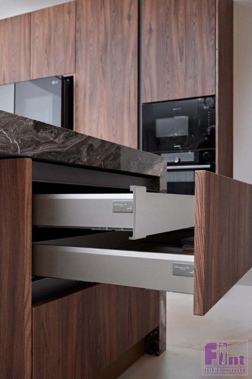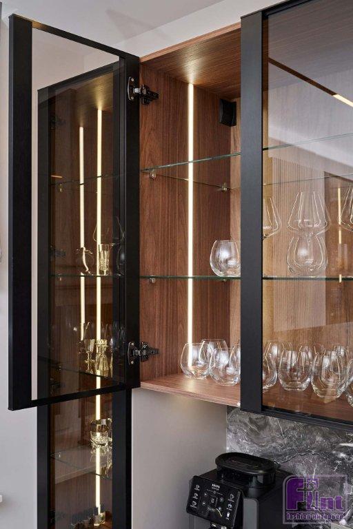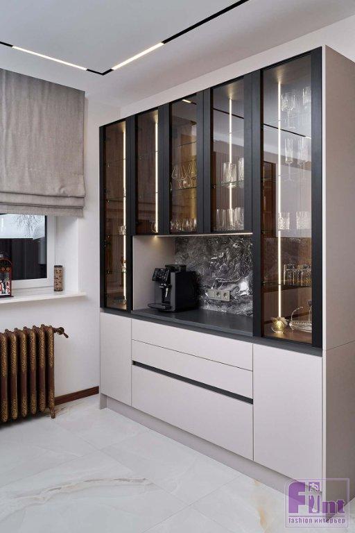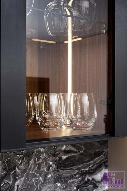 За фасадами предусмотрено очень много мест для хранения. Эргономичное и современное решение — «ящик в ящике». Оно позволяет рационально использовать пространство и аккуратно хранить большое количество самых разных предметов. Все секции со стеклянными фасадами оснащены красивой подсветкой с тёплым светом. Они создают особую уютную атмосферу и добавляют глубины пространству.