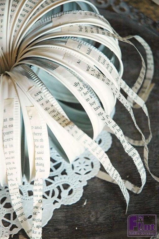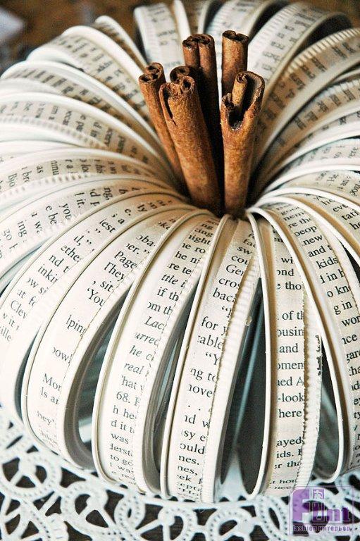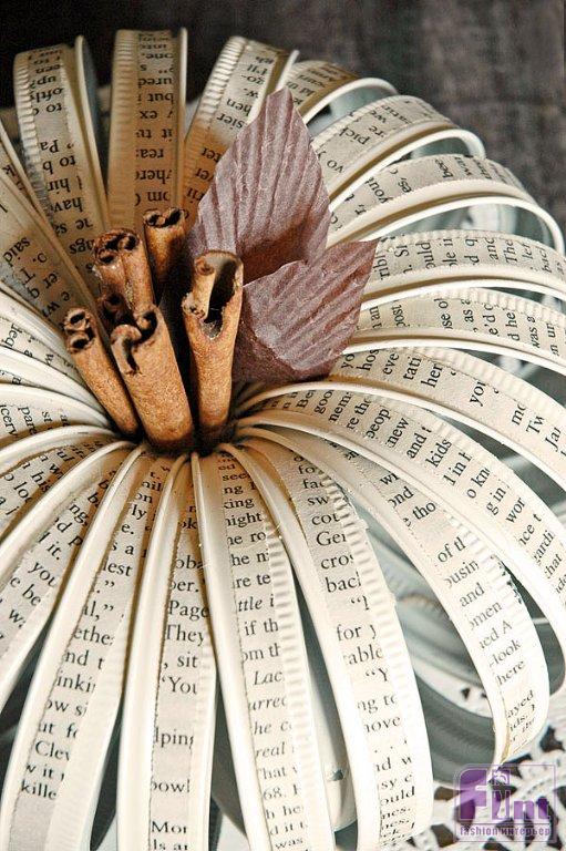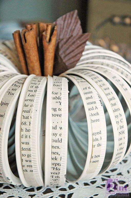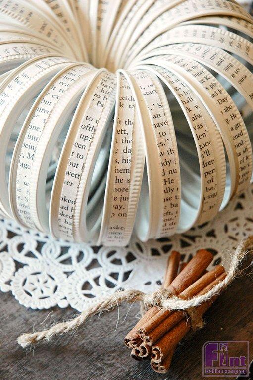 Пока краска высыхает, нарежьте несколько полосок декоративной бумаги для своей тыквы. Полоски из книжных страниц, которые мы использовали, были чуть меньше 18 сантиметров в длину и около 5-6 миллиметров в ширину. Ширина бумажных полосок должна быть меньше ширины колец, и соответствовать плоской части, чтобы надёжно и красиво на неё приклеиться.