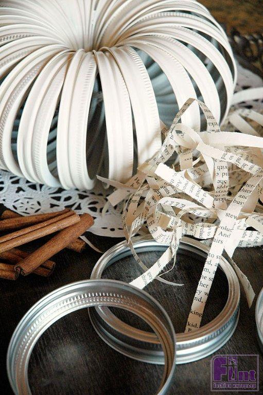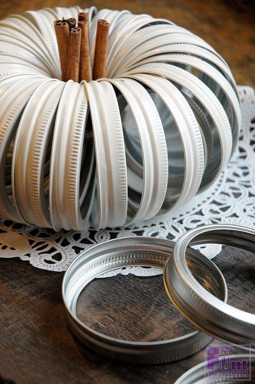 Вам понадобится примерно 20-25 колец, а не сплошные «серединки» от ваших крышек для банок Мейсона. Все кольца должны быть одинакового размера. Диаметр колец будет определять размер вашей будущей тыквы. Проденьте бечёвку через каждое кольцо, а затем плотно свяжите концы бечёвки, чтобы получился своеобразный «шар». Теперь, когда концы бечёвки спрятаны внутри колец, у вас есть уже форма тыквы!
