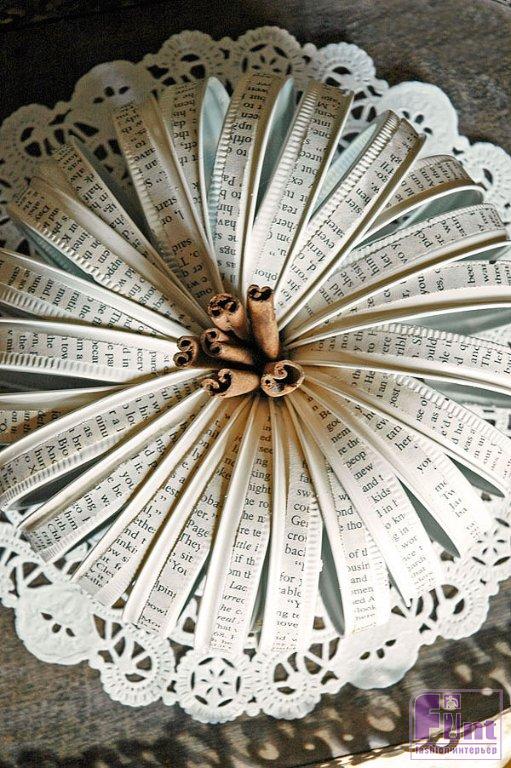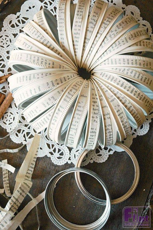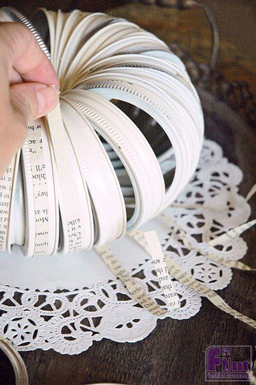 Нанесите 2-3 слоя аэрозольной краски на заготовку из связанных вместе колец для полного их покрытия. Мы использовали кремово-белую краску, поскольку она отлично будет гармонировать со старыми страницами из книги, слегка пожелтевшими от времени.