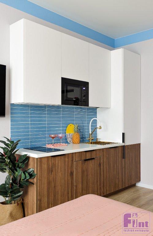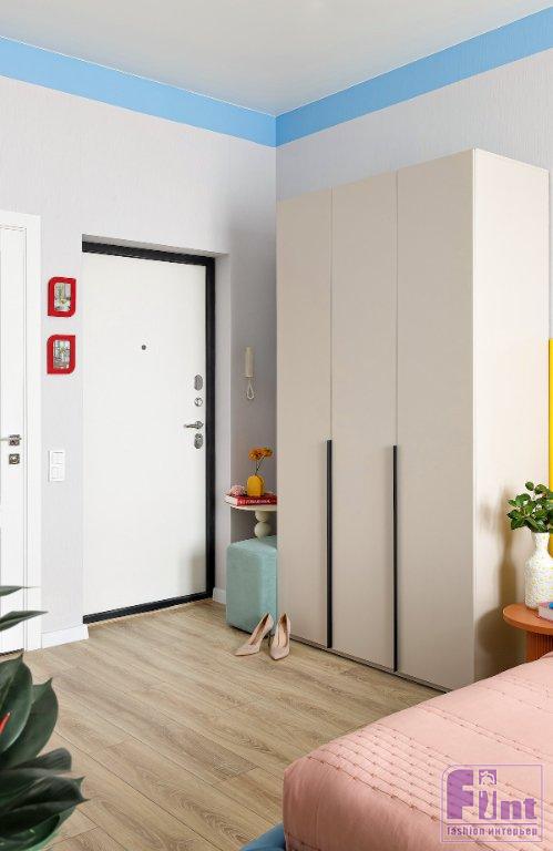 Эта маленькая студия в городе Сочи предназначена для сдачи в краткосрочную аренду. Заказчица обратилась к дизайнеру Анастасии Дубовсковой с запросом на яркие цвета и вау-эффект. Дизайнер интерьера Анастасия Дубовскова сделала ставку на модный приём — так называемый «дофаминовый интерьер», используя чистые яркие оттенки, цветные блоки и игривый декор.