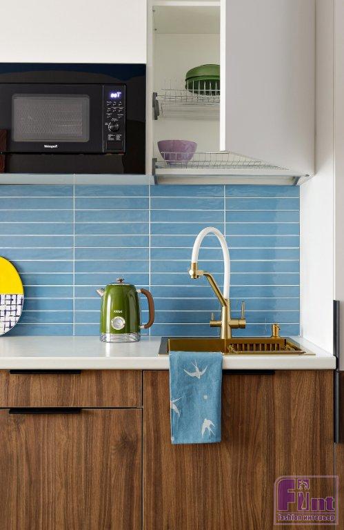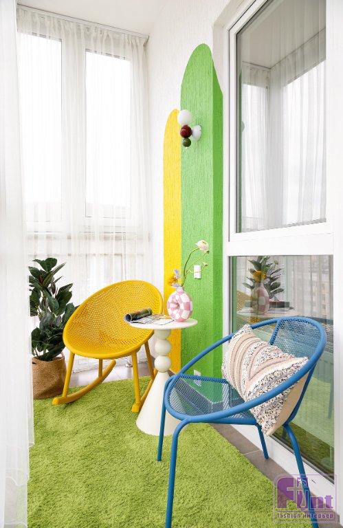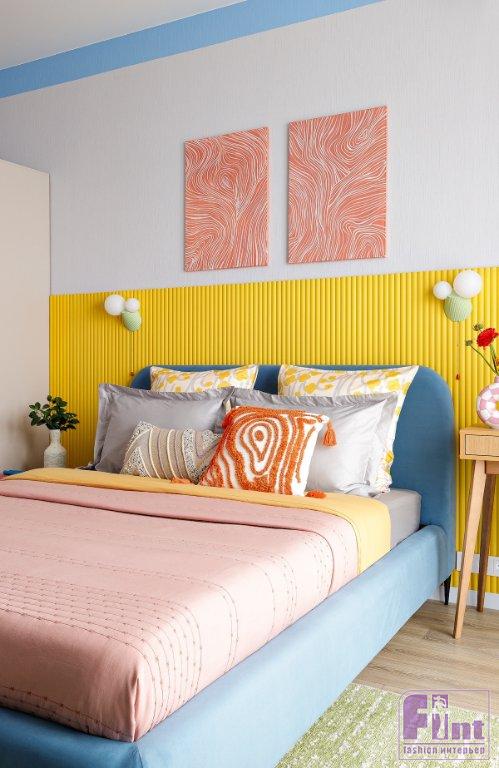 Однако главное в интерьере — не отделка как таковая, а цвет. Жёлтый, зелёный, голубой, вкрапления розового и красного — Анастасия использовала «чистые» и активные цвета, не стараясь их приглушить. Цвета применили по принципам колор-блока: на стенах в комнате и на балконе — выкрасы в виде арок, за кроватью — крупная панель, под потолком пущен яркий выкрас-«карниз», плитка на кухонном фартуке тоже поддерживает заданную концепцию.