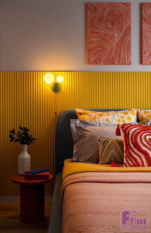 В проектировании освещения исходили из готовых электрических выводов от застройщика. На потолке — люстра. Её покрасили в красный для дополнительного акцента. За счёт того, что за кроватью установили панель, удалось скрыть новые электрические выводы под прикроватные бра, которые изначально не были предусмотрены.