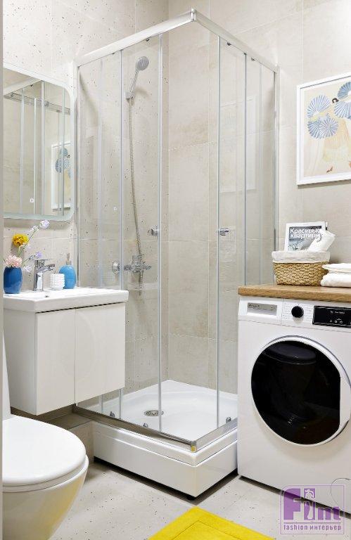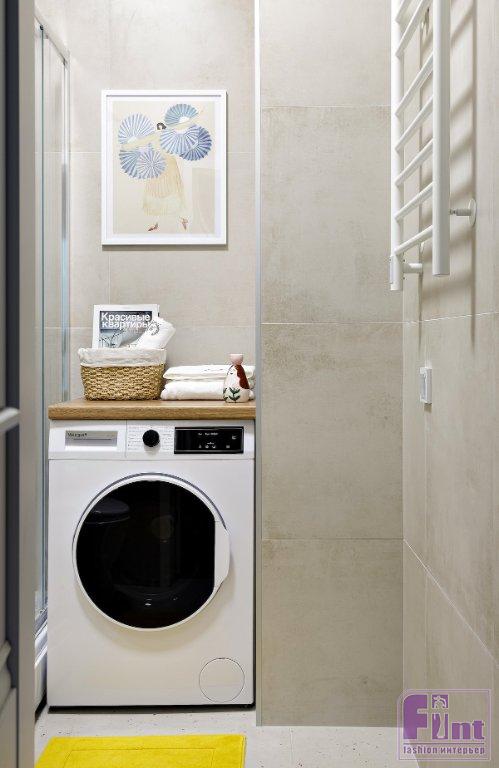 Кухонный гарнитур — компактный, со встроенным холодильником, встроенной микроволновой печью в верхнем шкафу, полками и ящиками для хранения. Хозяйка не хотела продумывать максимум спальных мест — поэтому выбрали комфортную двуспальную кровать, установили туалетный столик. Лоджия стала местом отдыха с креслами и комодом для дополнительного хранения вещей. В ванной был готовый набор сантехники, поэтому оставалось установить только стиральную машину. Над стиральной машиной установили полку, которую удобно использовать в качестве поверхности для дополнительного хранения полотенец и разных принадлежностей.