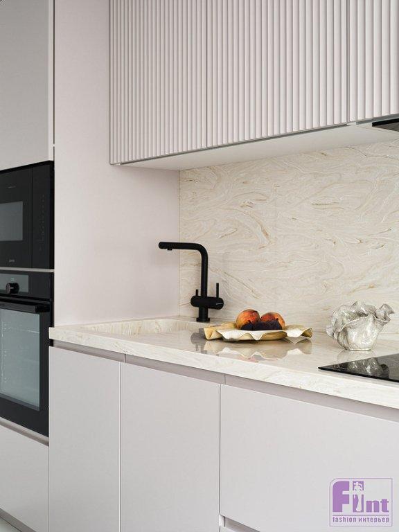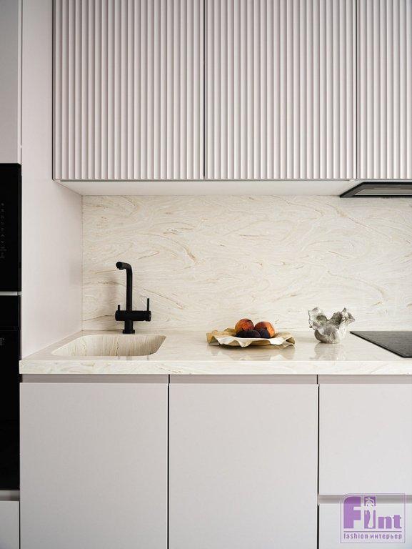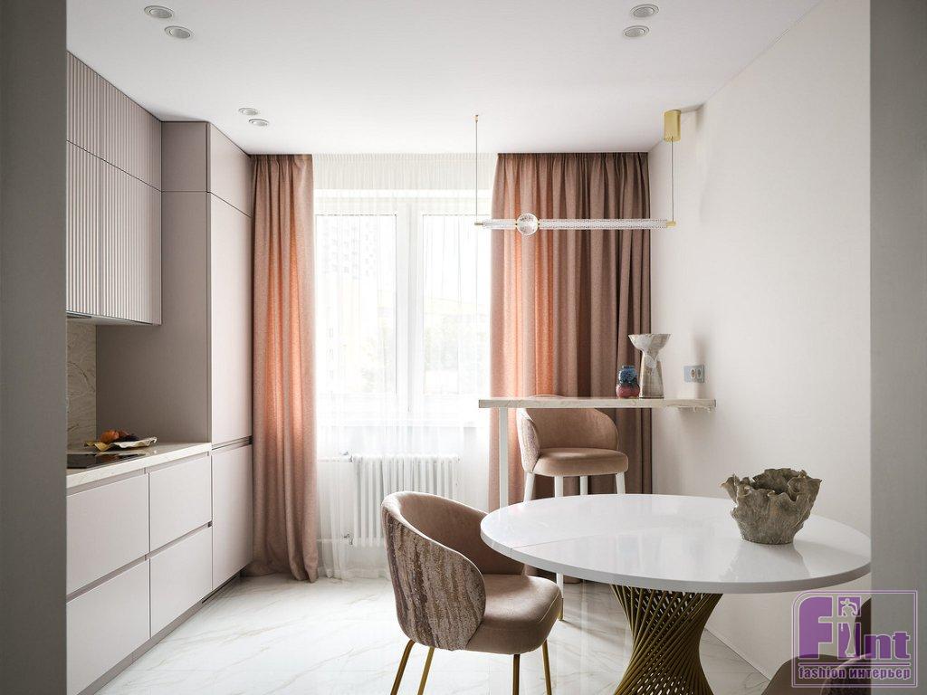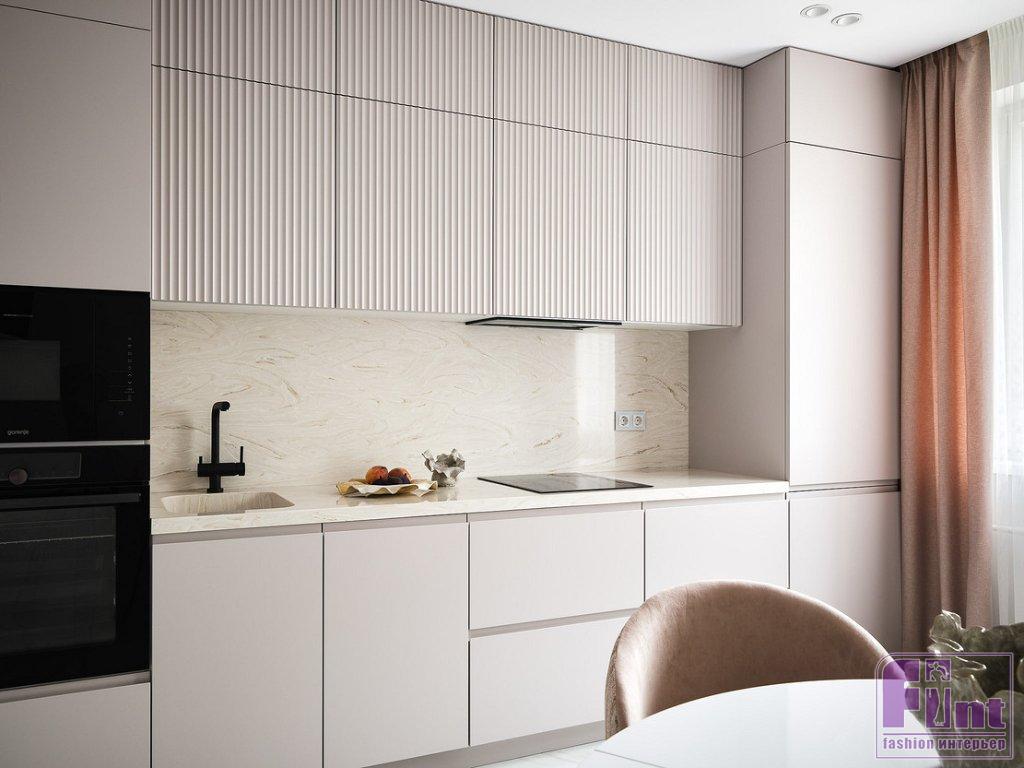 На небольшой кухне установили линейный кухонный гарнитур. По бокам — колонны со встроенным холодильником, духовым шкафом и СВЧ. В нижнем шкафу рядом с мойкой встроена посудомоечная машина. За счёт шкафов до потолка увеличили объём хранения. В дополнение к обеденному столу у окна поставили барную стойку.